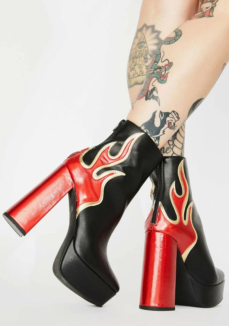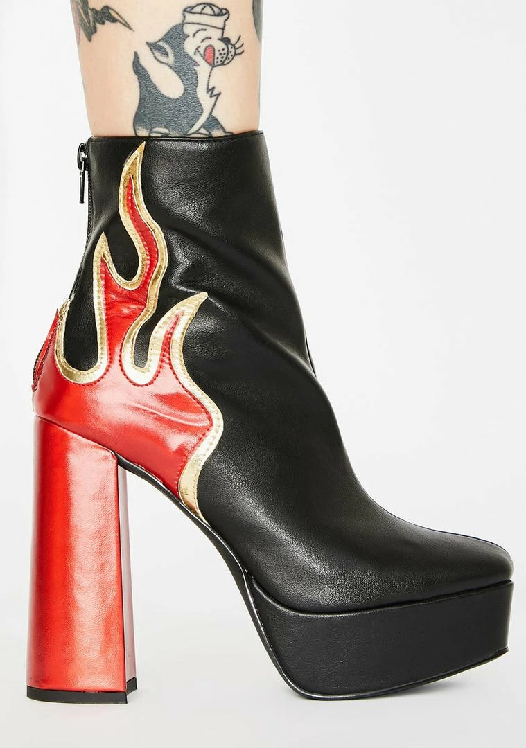 cuz you light our firez, bb. Yer a trailblazer in these platform ankle boots that have a vegan leather construction, a block heel, and iridescent flame details with gold trim.