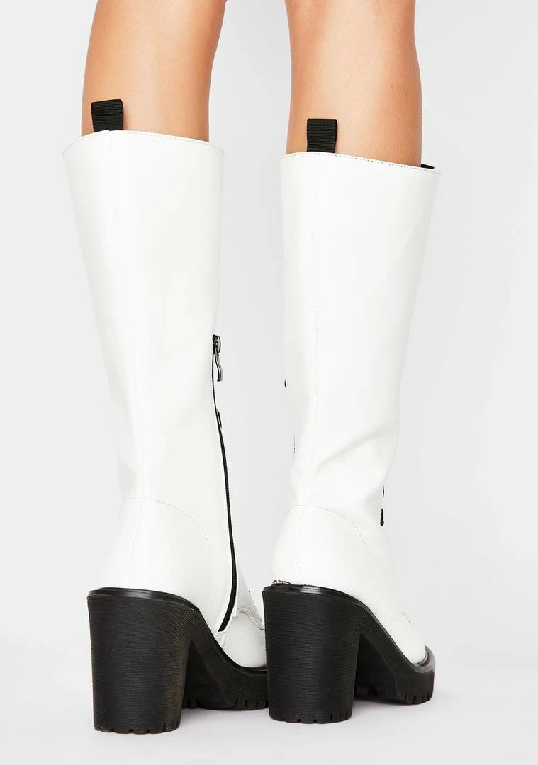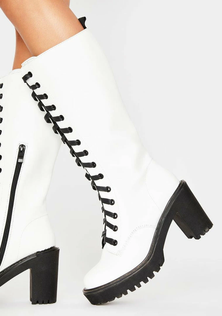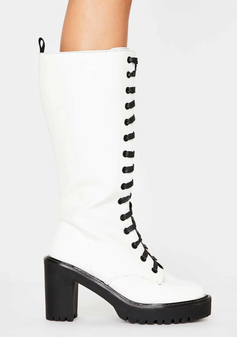 give em hell babe! Run tha world in these lace up boots that come up below the knee have a loose fit shaft and combat heel.
