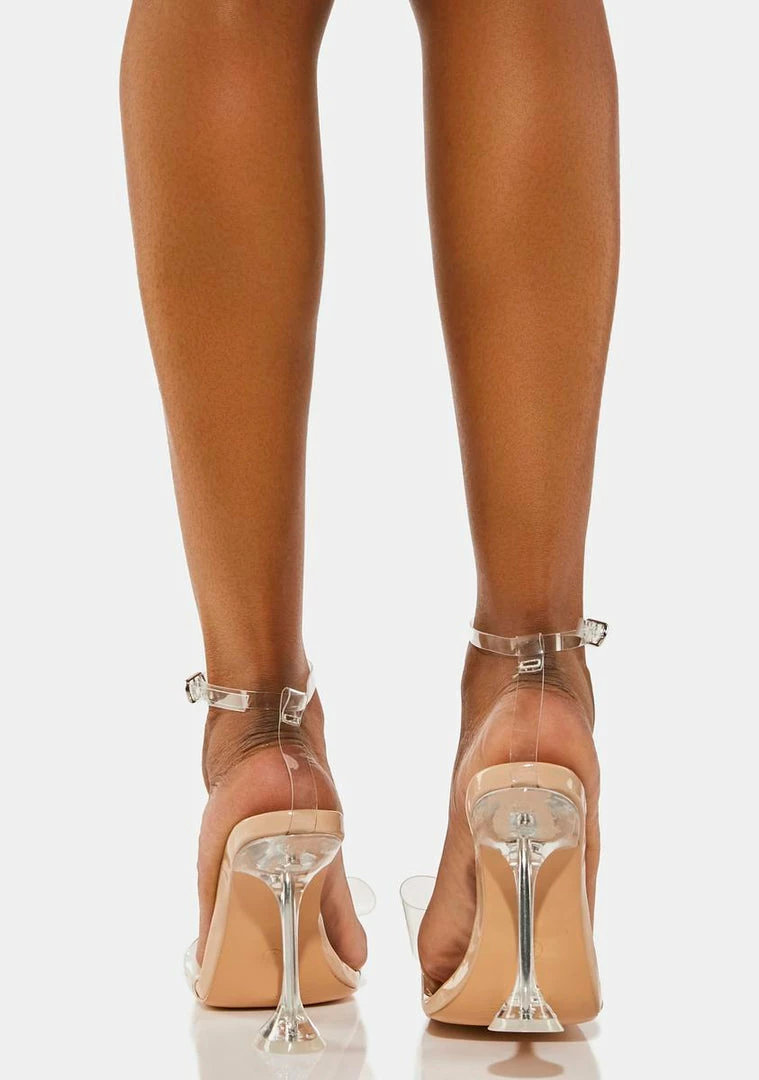 you go, girl! These heels have a translucent design, adjustable buckles at the ankles, peep toes with bow details, and sculpted stiletto heels.
