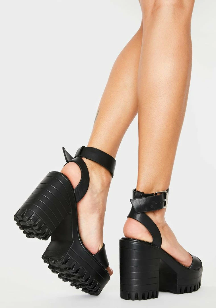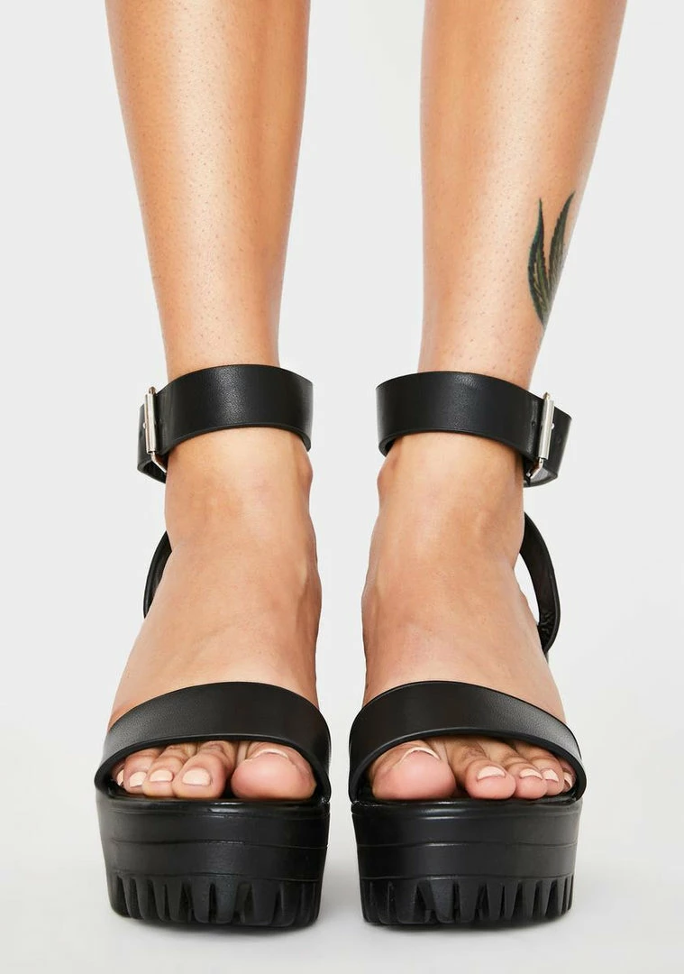 got ya makin tha city yer runway bb! Be a total fashion savage in these open-toed platform sandals with buckle closures on the ankle, chunky treaded soles and thiccc block heels.