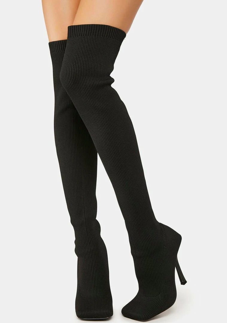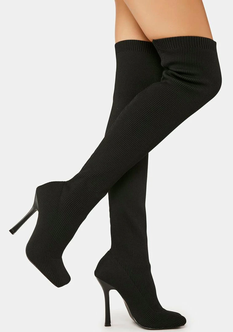 cuz you stand out. These boots come in a ribbed knit construction, stiletto heels, a square toe design, and a slip on fit.