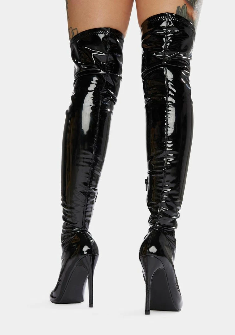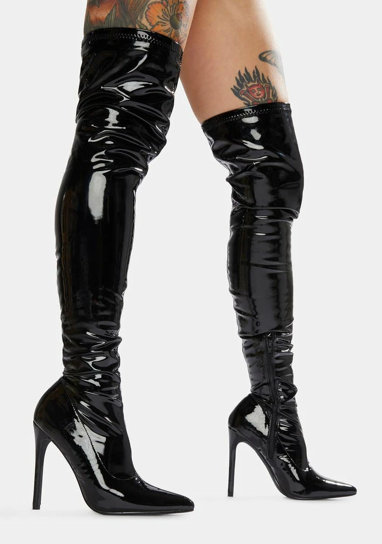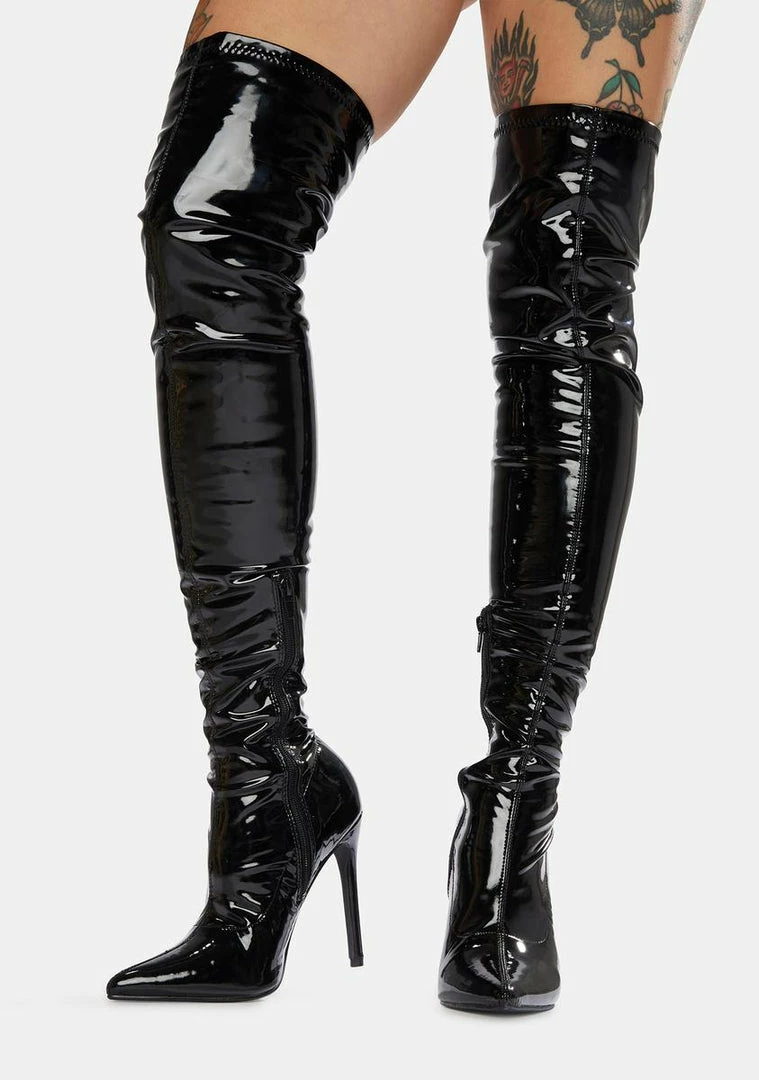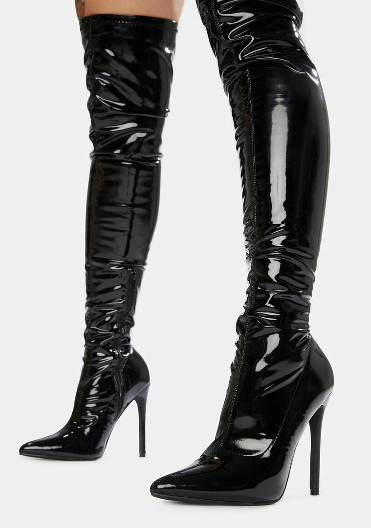 have an over the knee fit, a patent construction, side zipper closures, and stiletto heels.