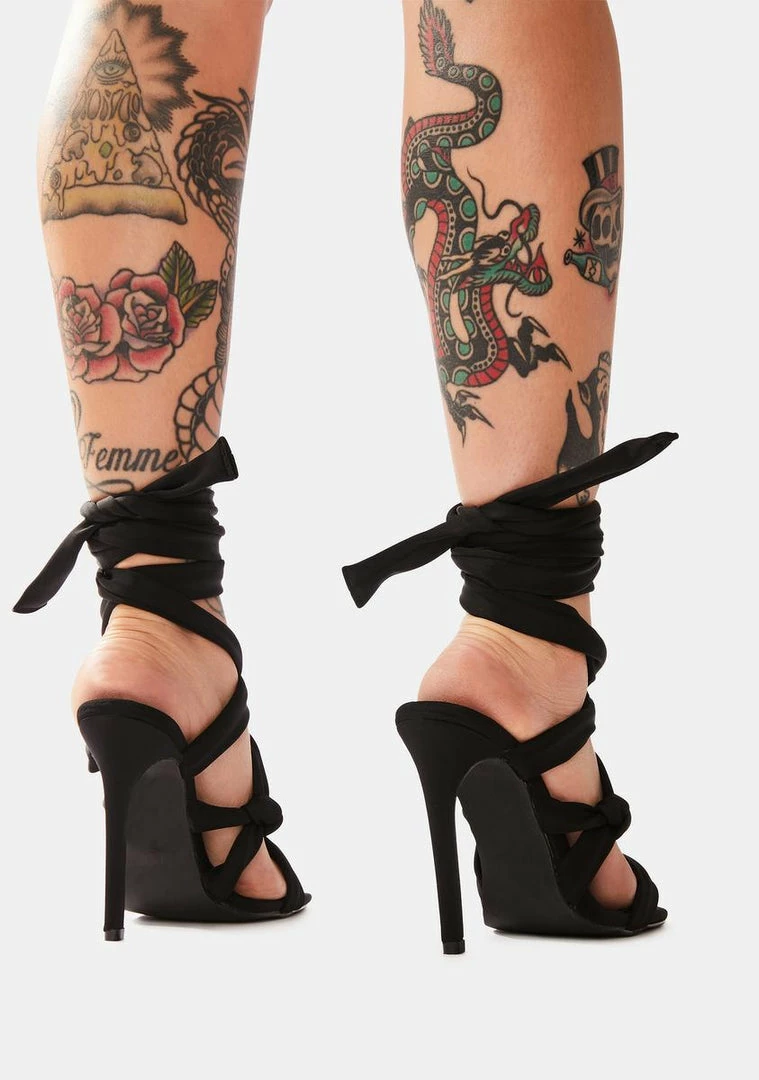 feature a knotted vegan leather construction with a strappy design, stiletto heels and back tie closures.