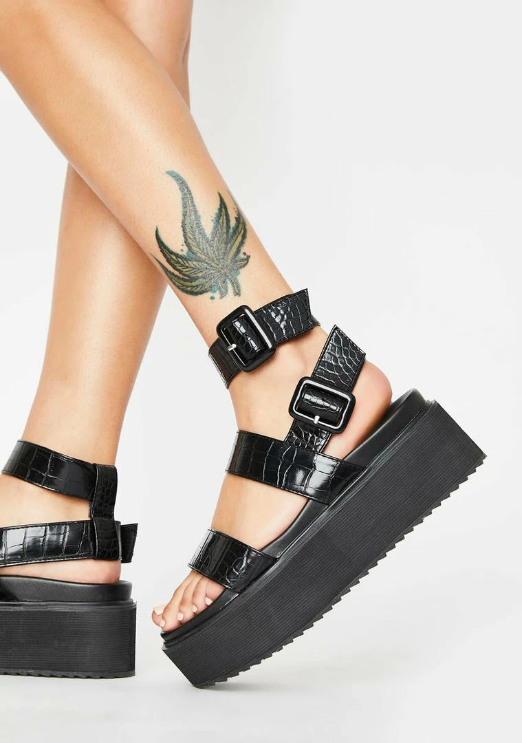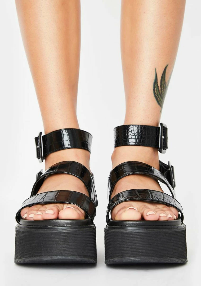 cuz yer feelinΓ’ΒΒ fierce AF, babe! Look lethal in these platform sandals with vegan leather croc embossed straps and buckle closures.