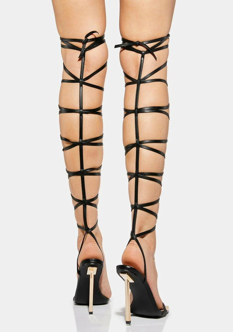 you make it look so easy! These heels have a vegan leather construction, wrap ties up the leg, peep toes, and stiletto heels.