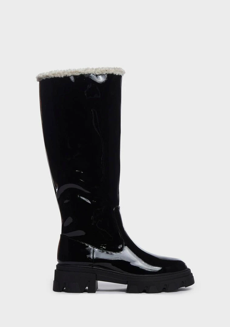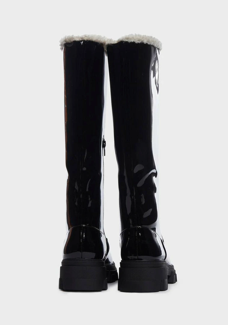 show them up. These boots come in a vegan leather construction, with a lug sole, inner zip closure, and faux fur trim.