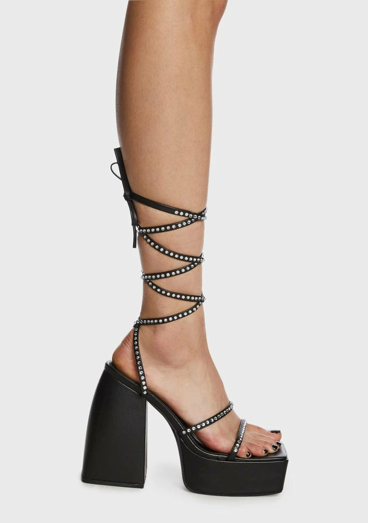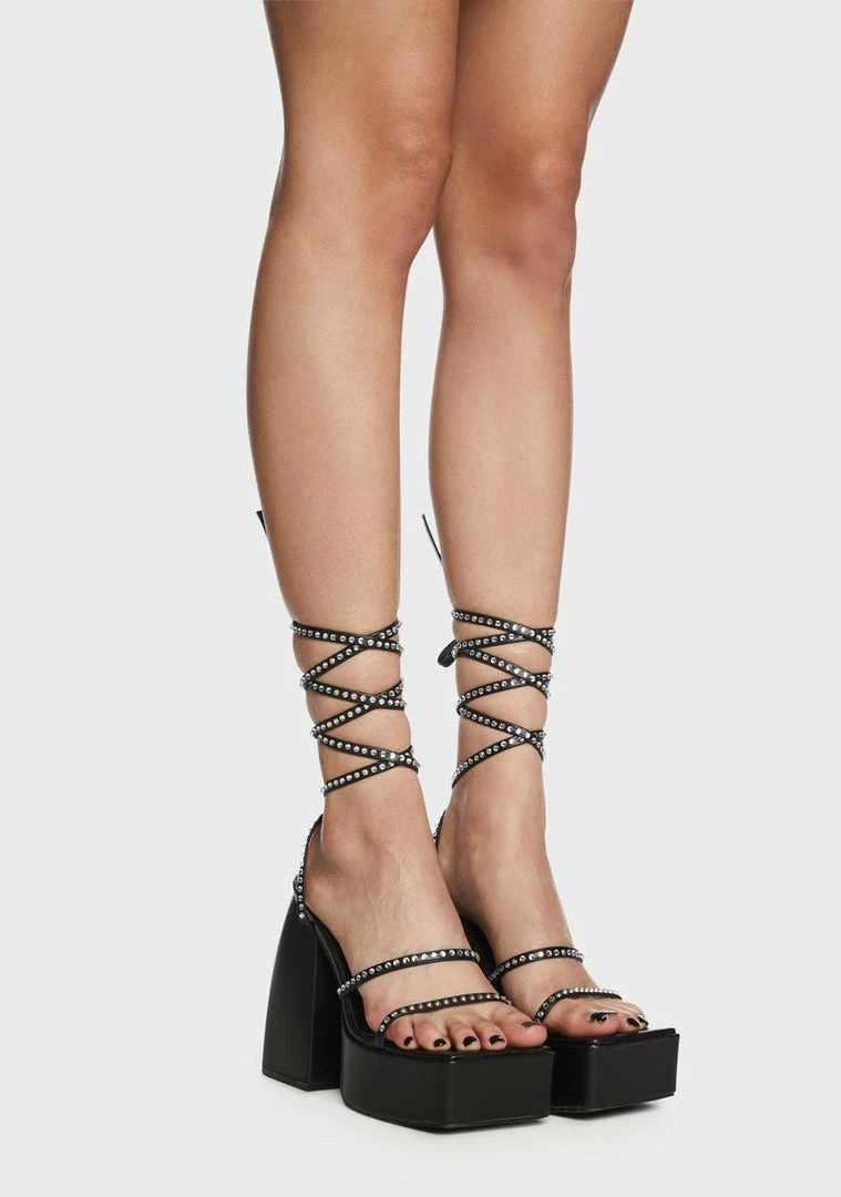 got you ownin’ the room! These platform heels have a vegan leather construction, adjustable lace-up ties with rhinestones, square toes, and curved block heels.