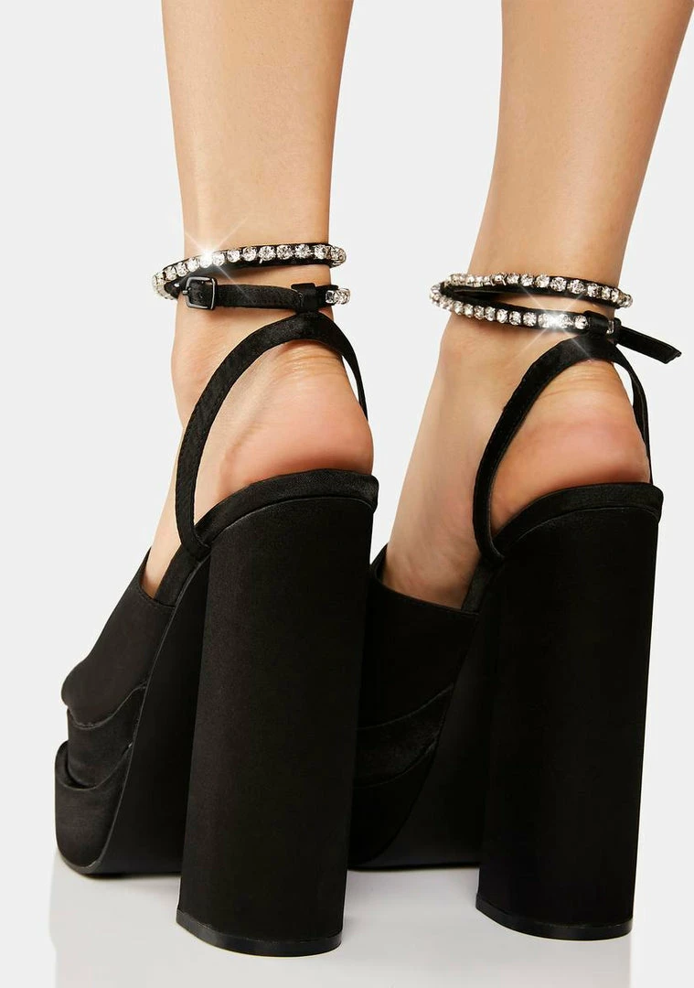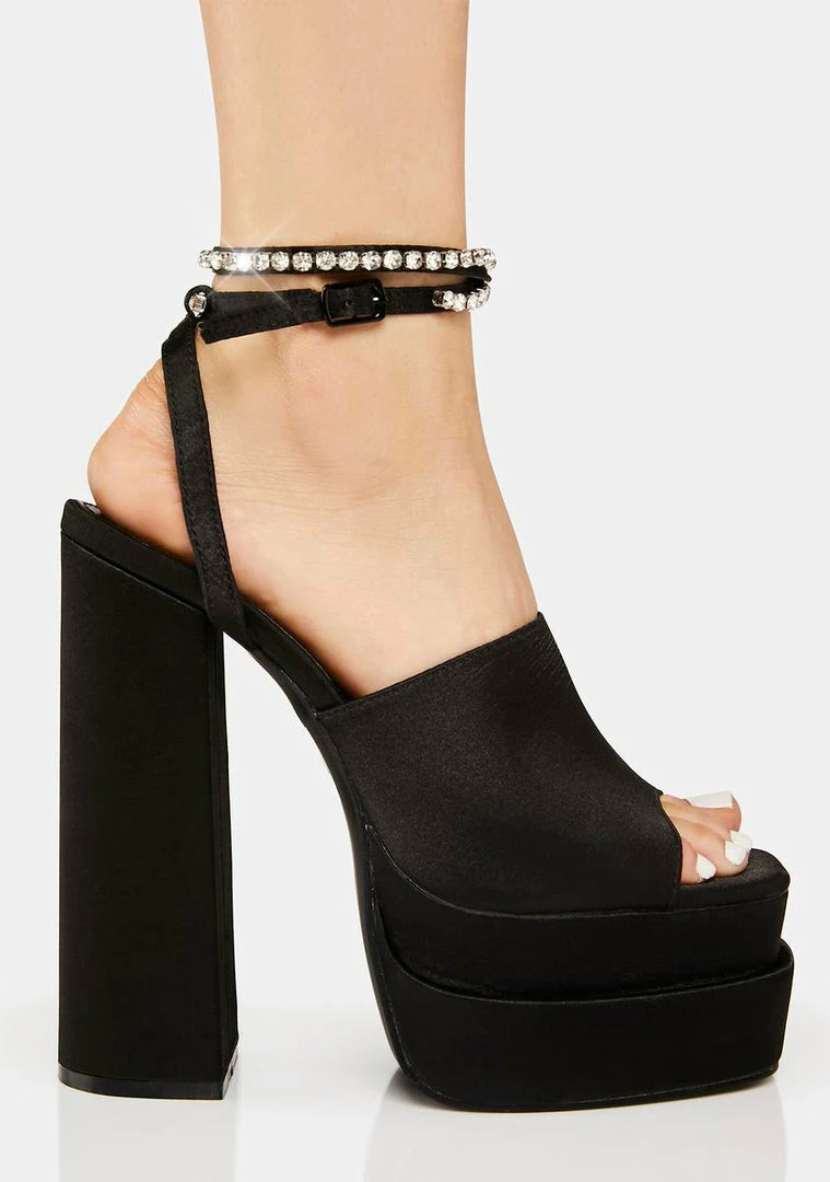 cuz you’re made for royal life. These platform chunky heels have a satin construction, an open toe design, and a diamante detailed buckle closure.