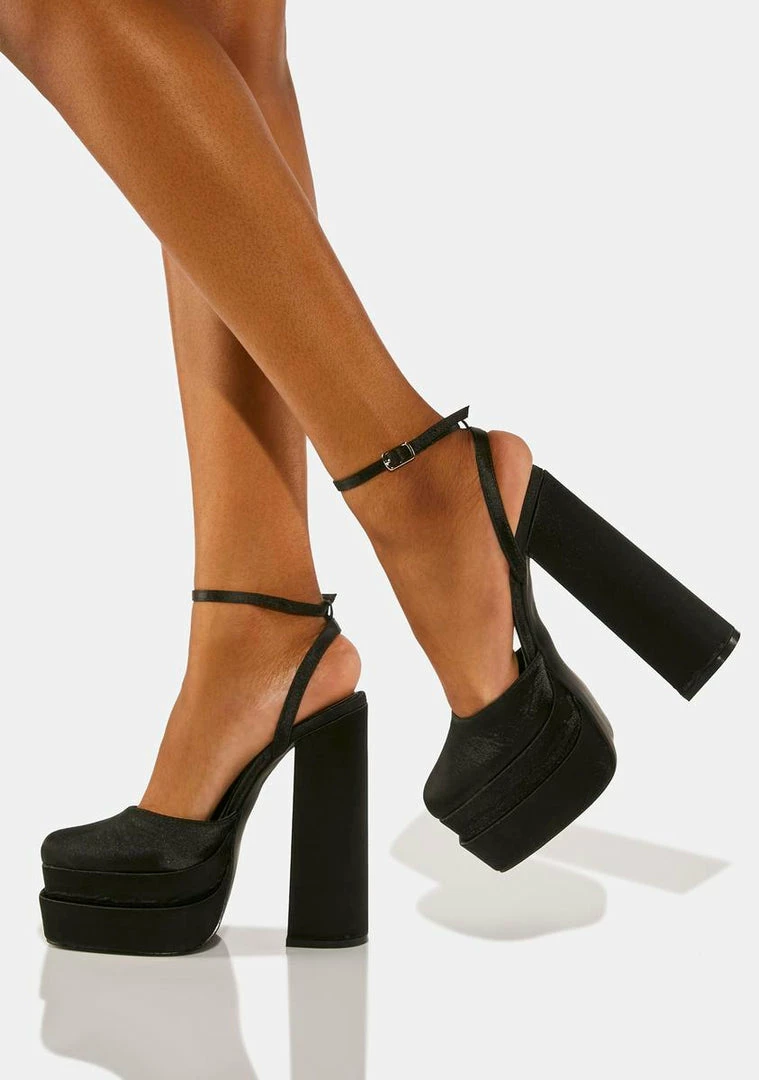 you’re up all night. These heels have a satin design, square toes, adjustable buckle ankle straps, and platform soles.