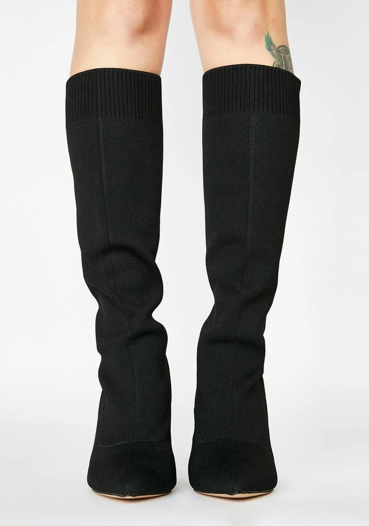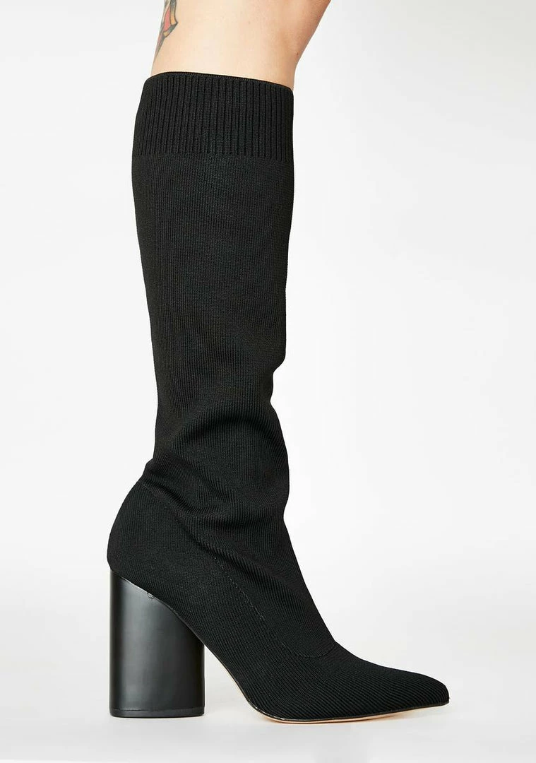 keep it cute, sis. Lead the pack in these trendy knee high boots that have pointed toes, supa soft Nรขยย stretchy material Nรขยย block heels.