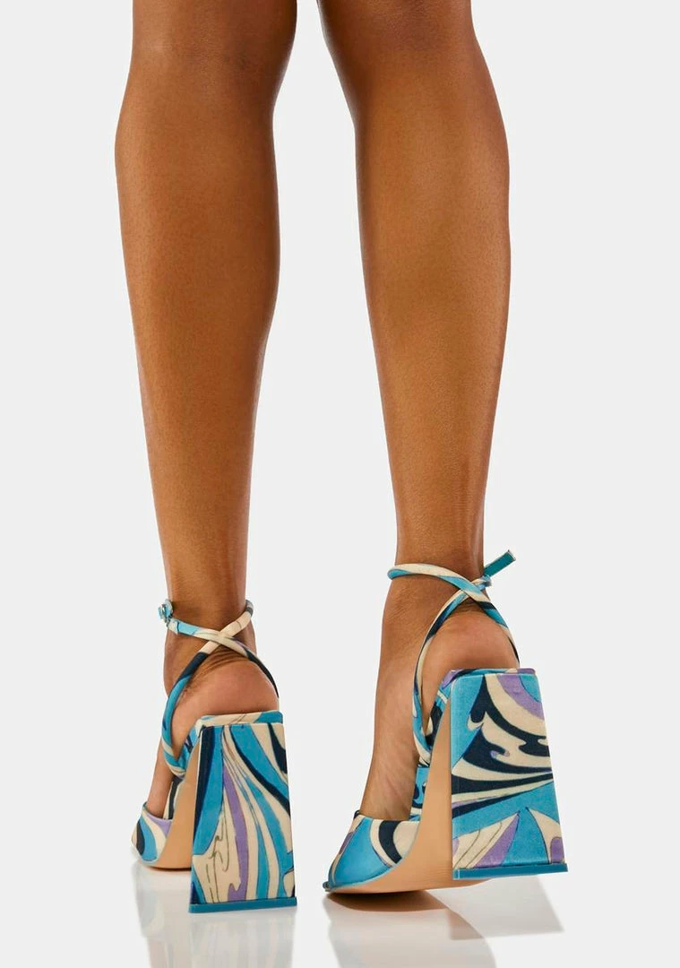 cuz you deserve a night out! These heels have a multi-colored abstract design, peep toes, adjustable buckle ankle straps, and angled block heels.