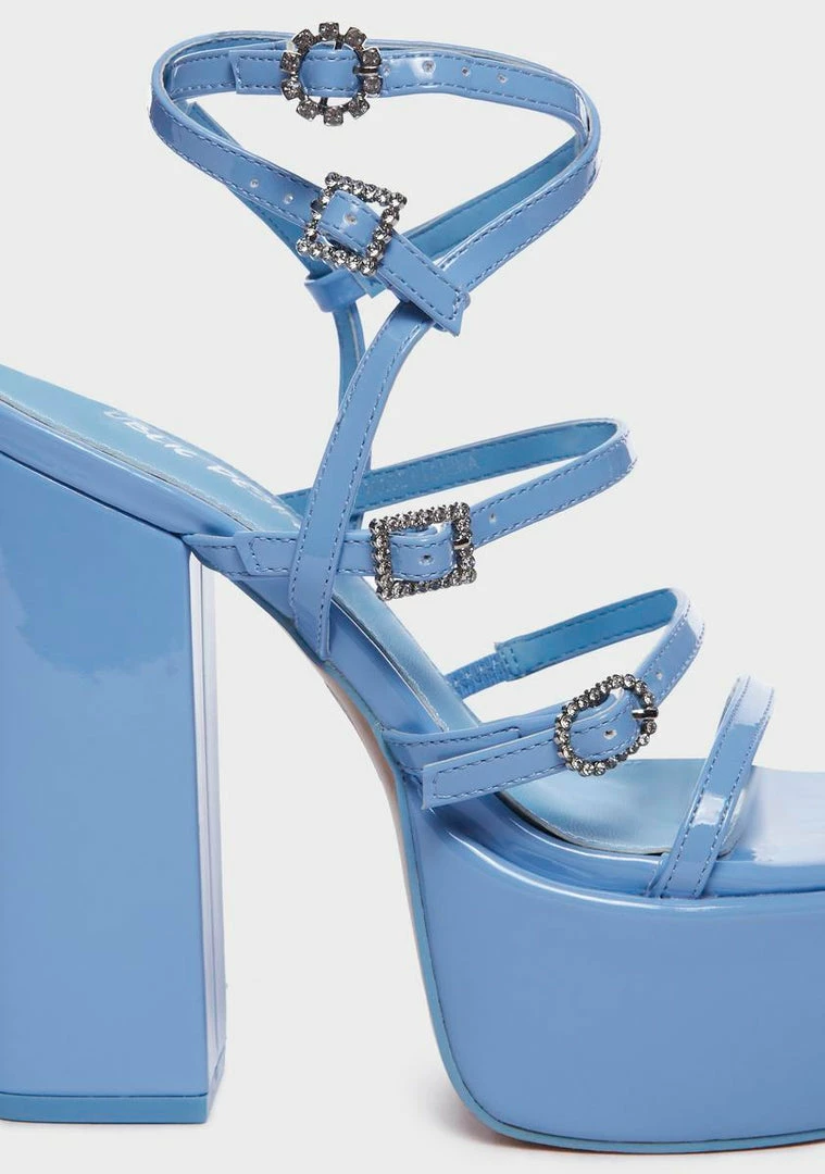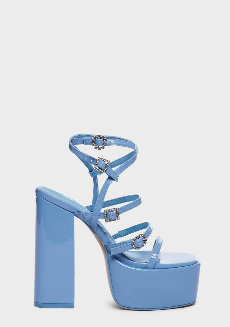 cuz I dare you to tell me otherwise. These shoes come in a patent vegan leather construction, with a platform heel, strap details, and rhinestone buckle closures.