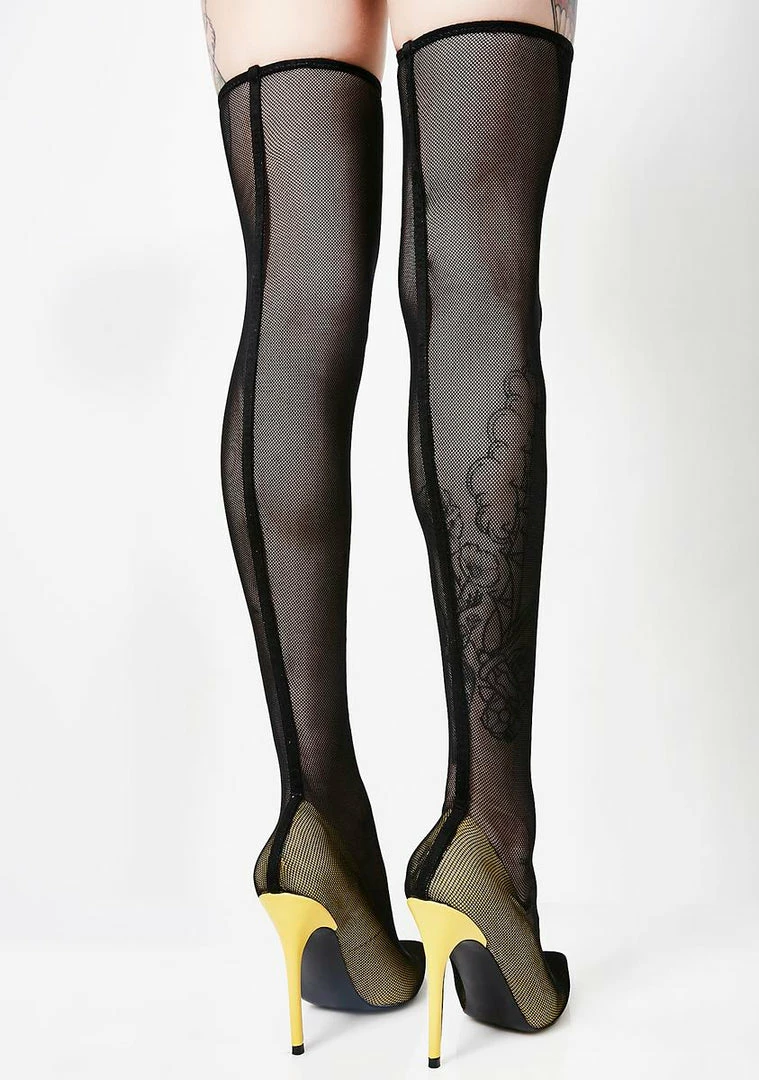 what you wanna feel like a straight up boss. These sheer thigh high heels have a back seam detail and a chic pointed toe.
