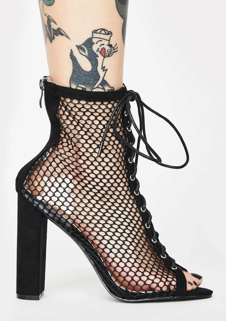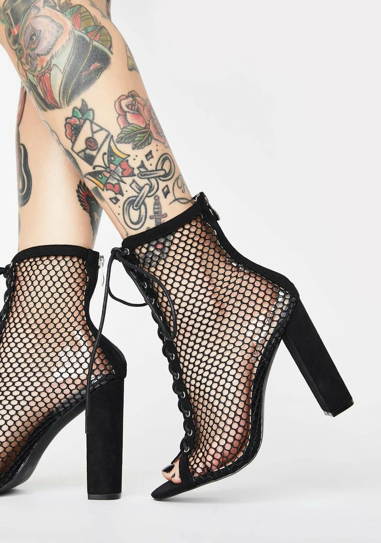 whatâs a party if ya donât watch the sun come up? Go all night in these hott ankle booties that have block heels, a clear mesh construction, adjustable lace-ups and back zip closures.