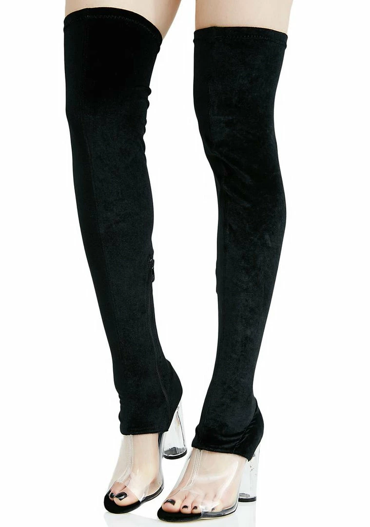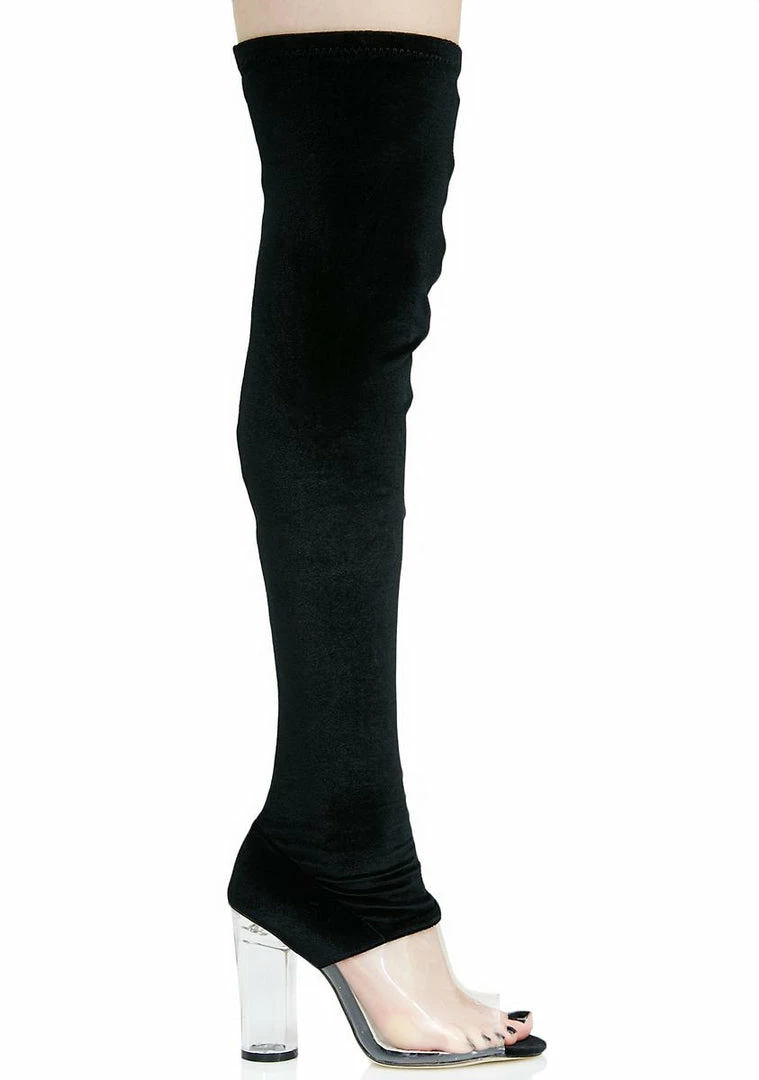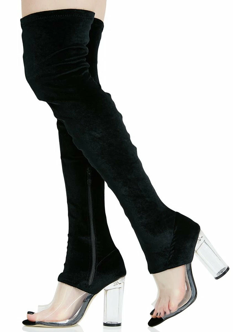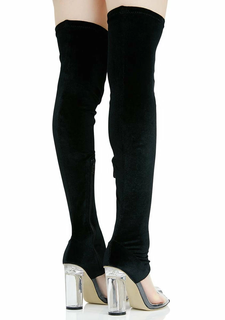 you got us seeinâ clearly, bb! Theyâll be doinâ double-takes when you stomp the streets in these sikk af boots featuring rounded clear lucite block heels, clear perspex front detailing, stretchy thigh-high construction, peep toes, and inner-ankle zipper closures.