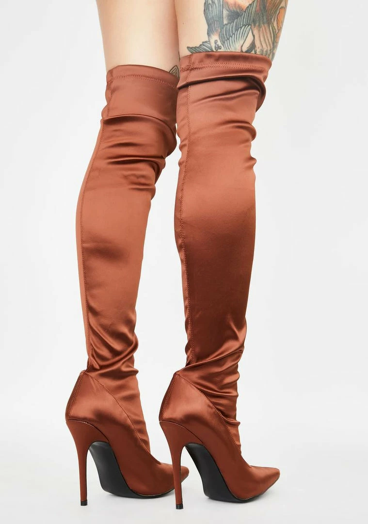 cuz youรขยยre dripping in glam, bb. Youรขยยre bougie and you know it in these over the knee boots that have a soft satin construction, a pointed toe, and stiletto heel.