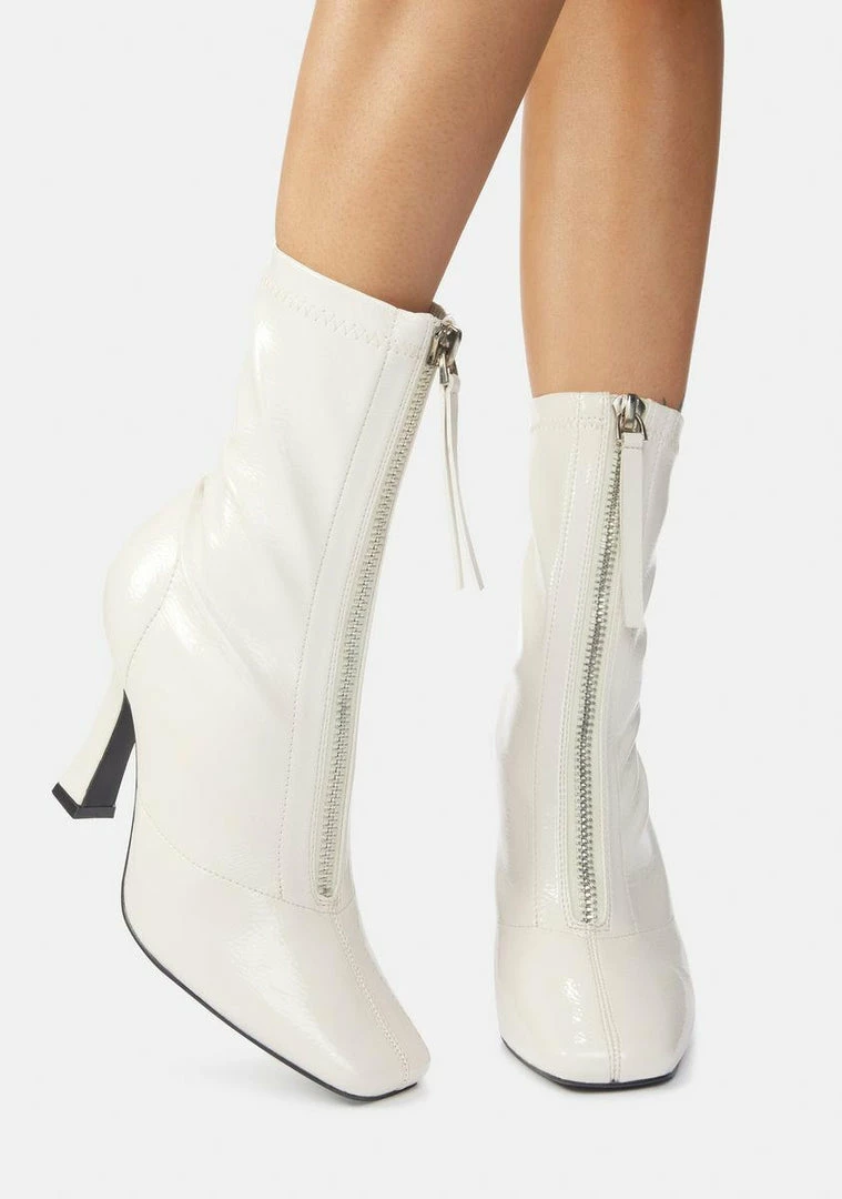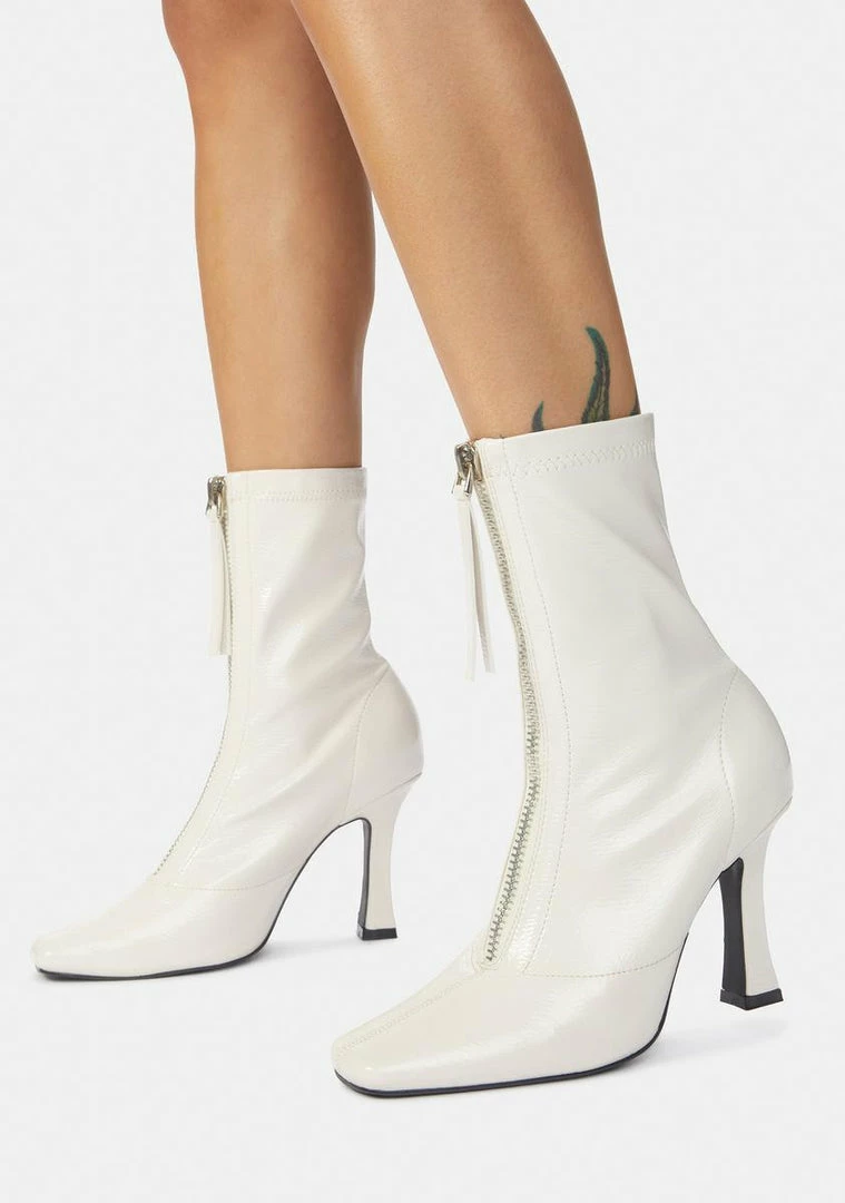 features a vegan leather construction, square toes, front zip-up closures, and stiletto heels.