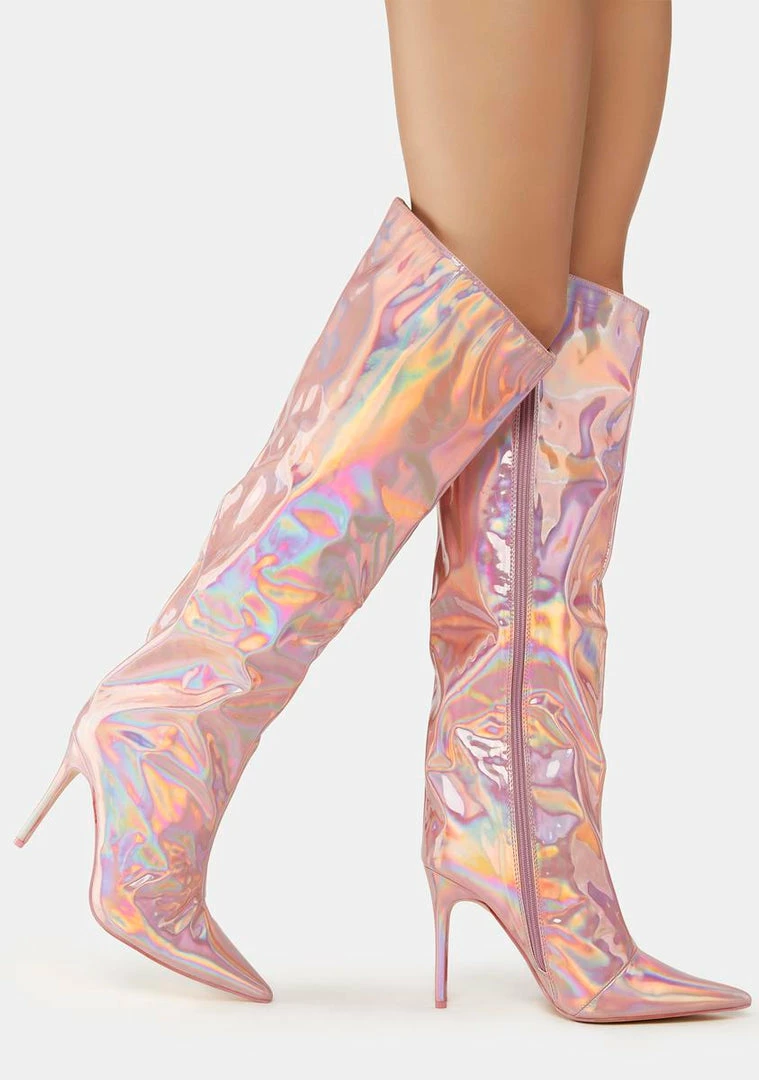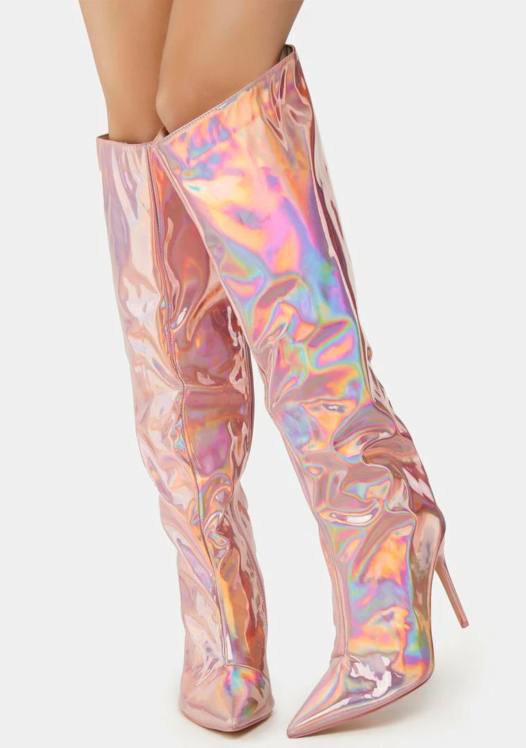 cuz you’re goin’ in a new direction. These wide width/wide calf boots have a patent vegan leather construction, a trippy holographic finish, inner zip closures, pointed toes, and stiletto heels.