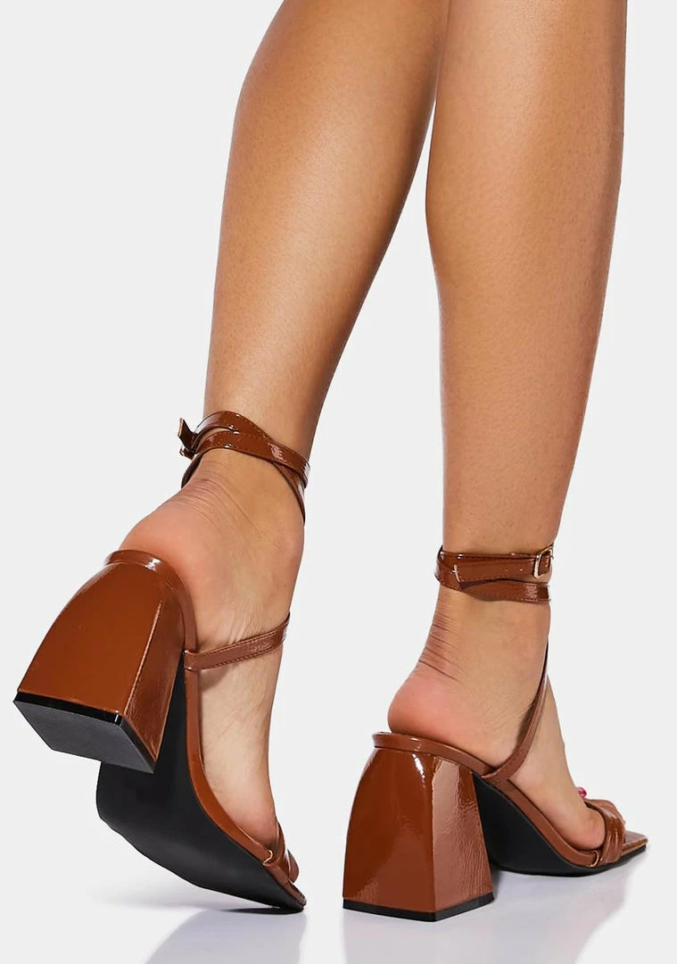 have a chunky heel, a strappy vegan leather design, and a buckle closure at the ankle.