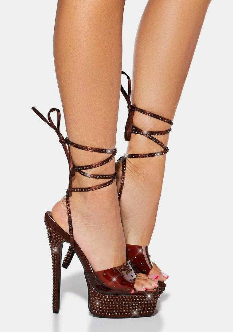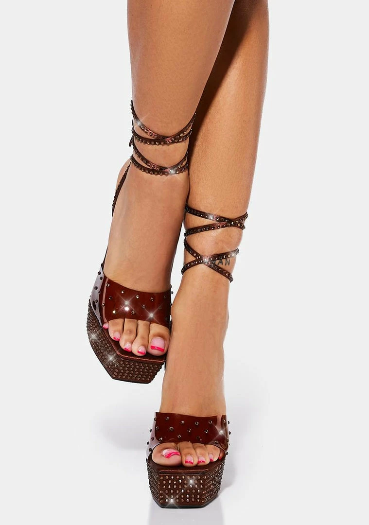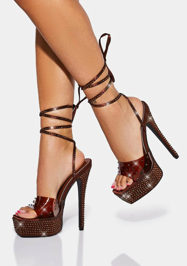 have a platform sole and stiletto heel, string tie lace ups, a translucent PVC upper, and diamante studs all over.