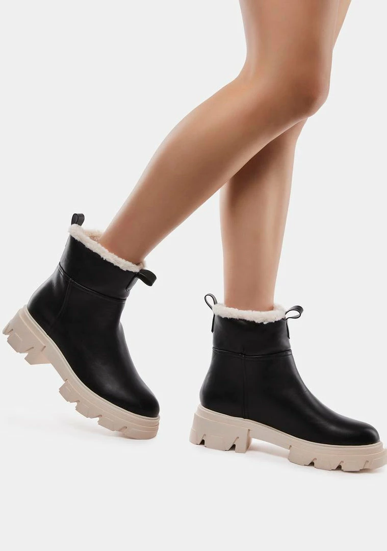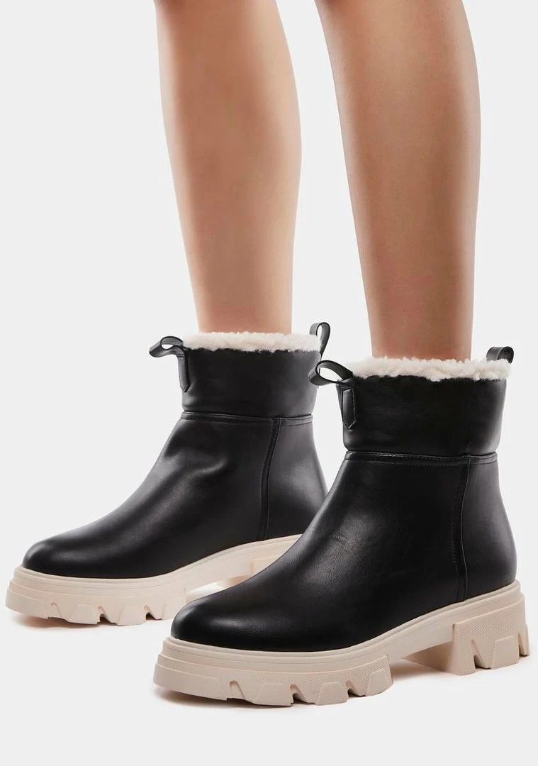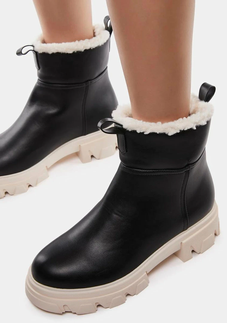 cuz temps are droppin’ quick. These ankle boots have a vegan leather construction, faux shearling trim, pull loops, and molded platforms.