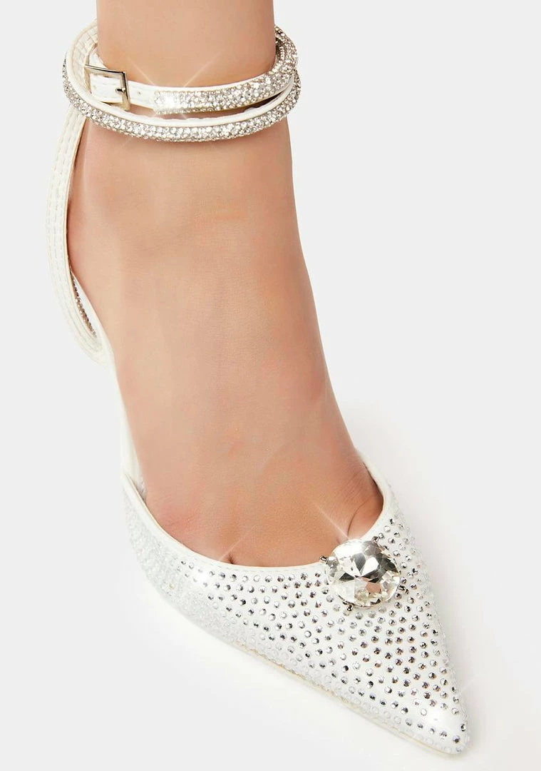 cuz you’re a diamond in the rough. These heels have sparkly diamantes embellished all over, a vegan leather construction, wraparound adjustable ankle straps with buckle closures, and pointed toes.