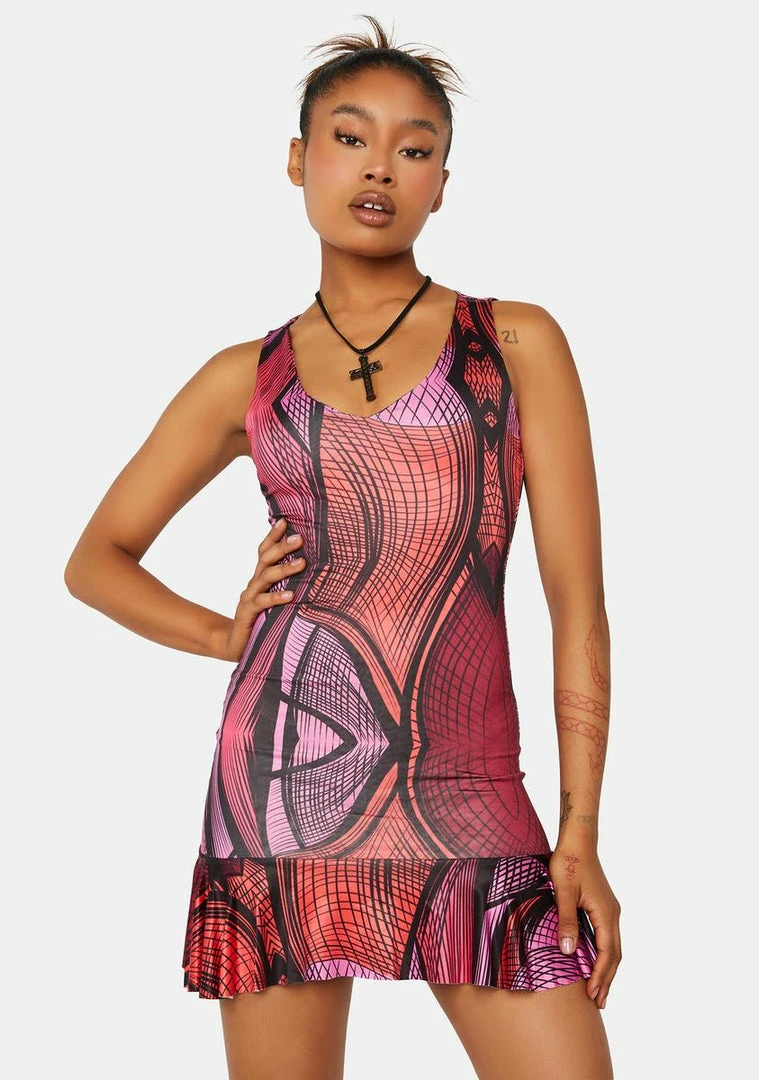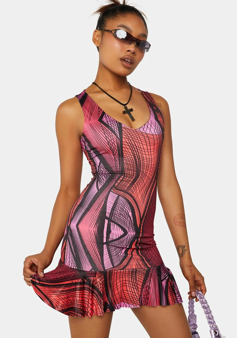 cuz you’re out of this world! This sleeveless mini dress has a futuristic abstract print all over, a curved V-neckline, and a ruffled hem.