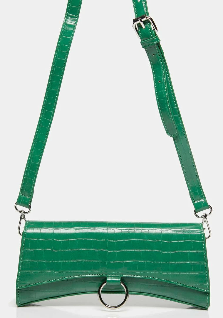 cuz you’re going out! This handbag has a vegan leather construction with faux croc texture, a top flap with O-ring hardware, an arched shape, and an adjustable and detachable crossbody strap.