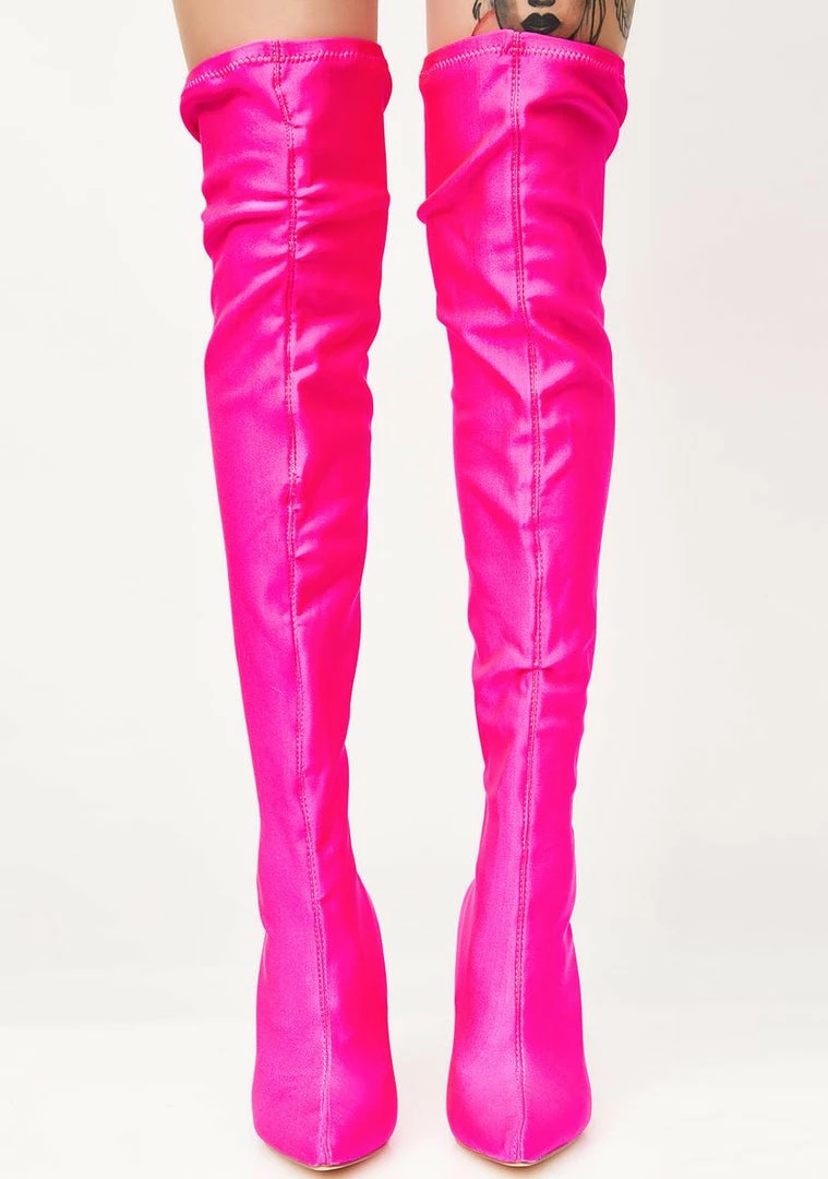 cuz you take it to the edge. These hot pink boots have pointed toes, skinny stiletto heels, and inside zipper closures.