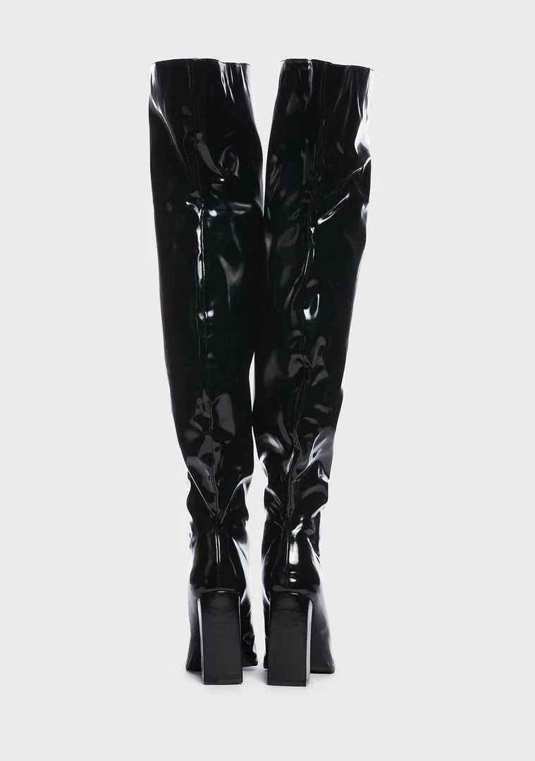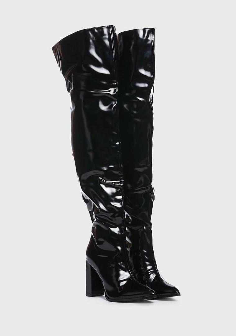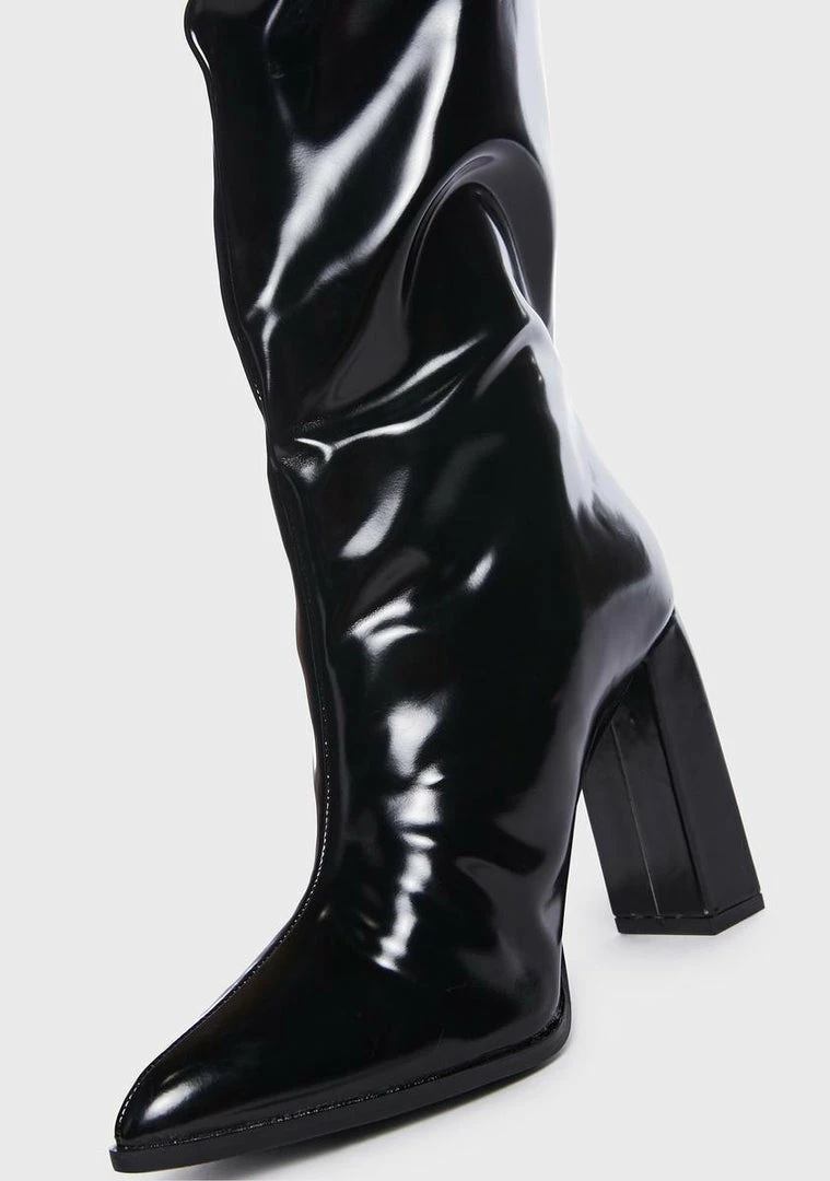 cuz you live for danger. These boots have a vegan leather construction, a vinyl finish, a pointed toe design, block heels, and zipper closures.