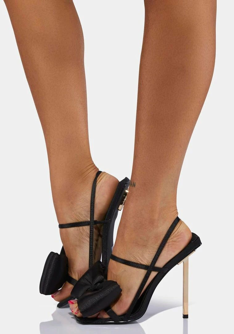 have a satin design with strappy uppers, large decorative bows at the front, square toes, and stiletto heels.