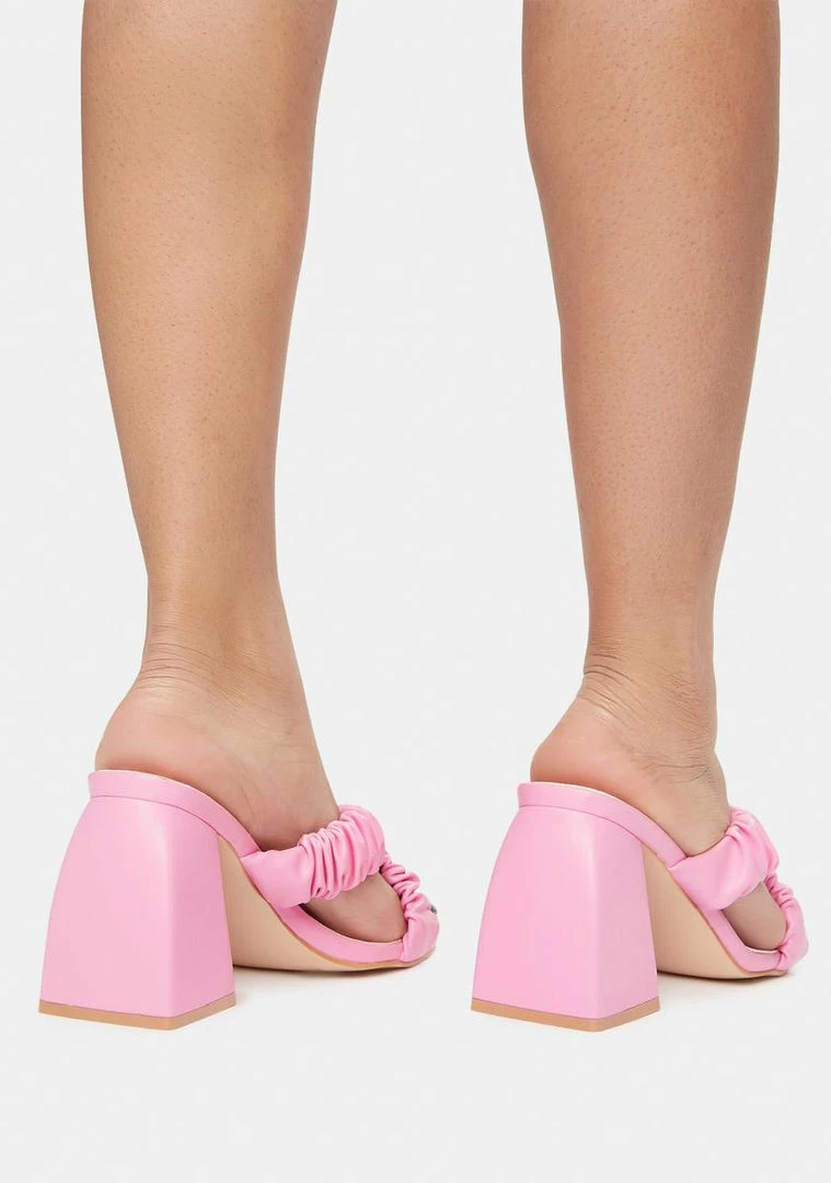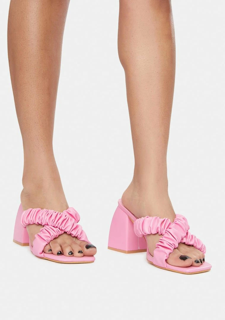 feature a chunky block heel and vegan leather ruched criss cross upper.