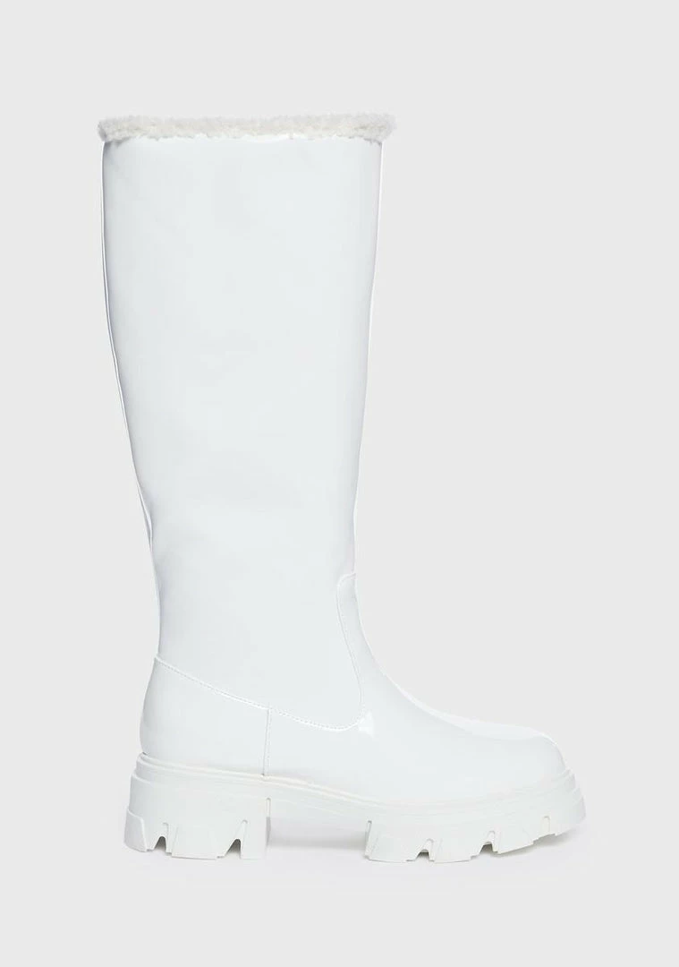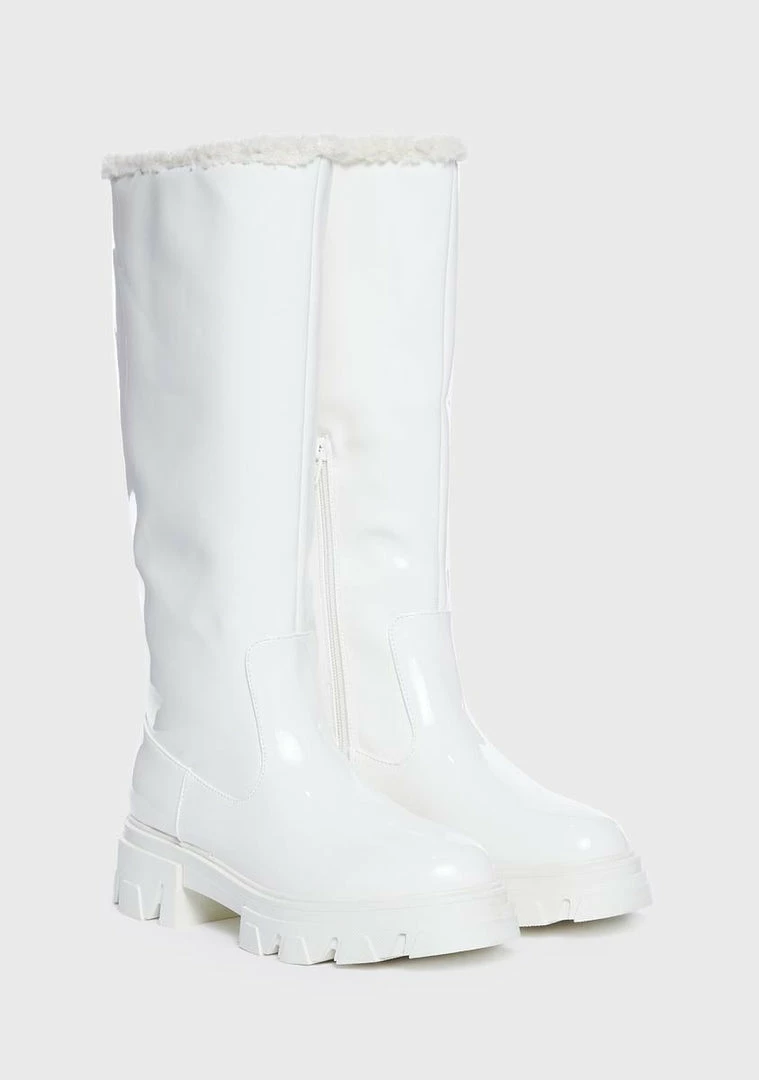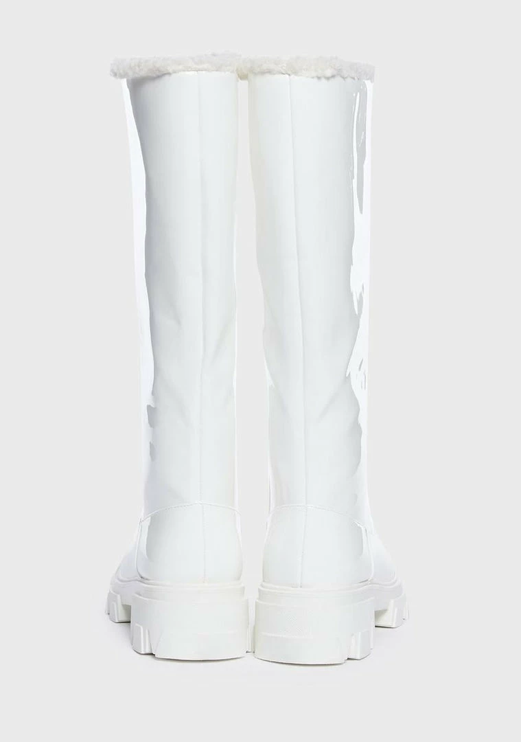 show them up. These boots come in a vegan leather construction, with a lug sole, inner zip closure, and faux fur trim.