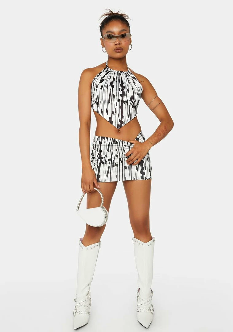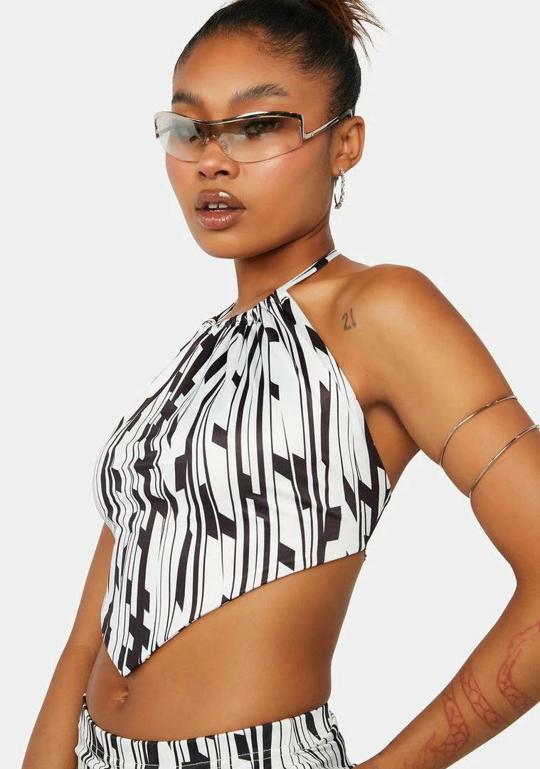 has you comin’ back from the future. This cropped tank top has an ultra-modern geometric print all over, a cinched high neckline with adjustable halter ties, and a bandana-style hem.