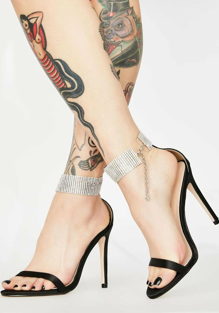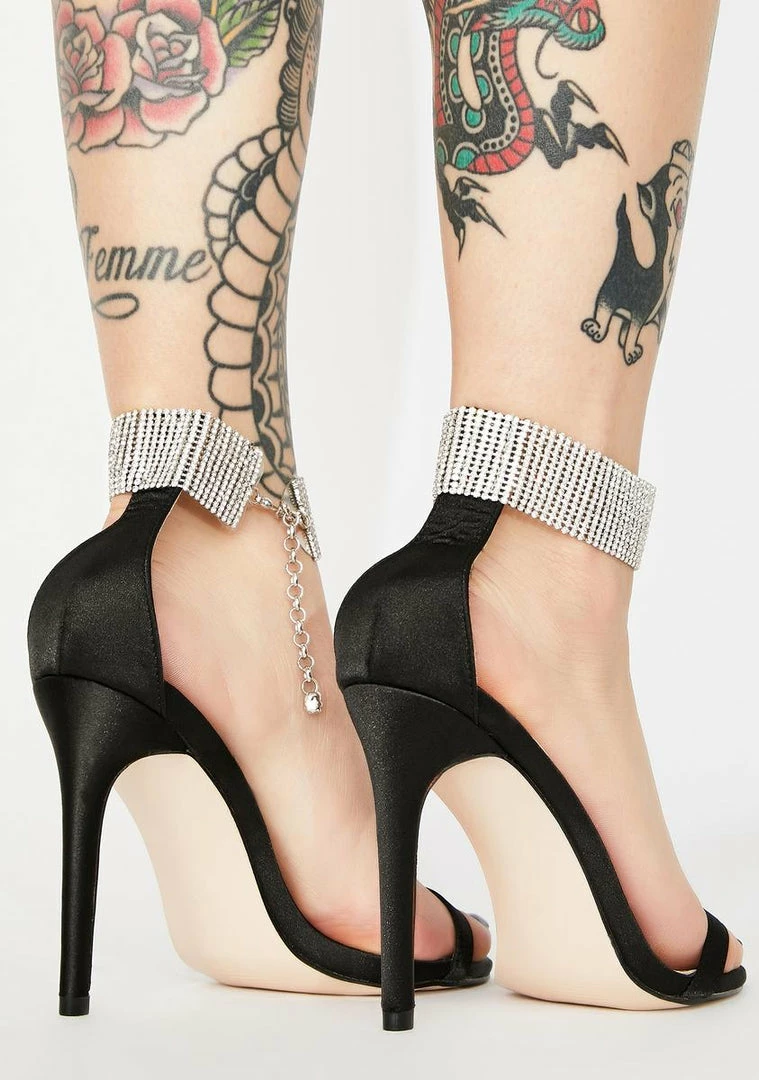 got ya feelin’ extra and lovin’ it. Rise Nรขยย shine in these glamorous satin heels that feature thin toe straps, stiletto heels, and thicc rhinestone ankle straps with adjustable clasp closures.