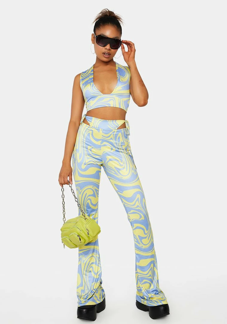 cuz you’re feelin’ cheeky. This crop top has a trippy swirl print all over, a plunging neckline with a banded waist, and a bodycon fit.