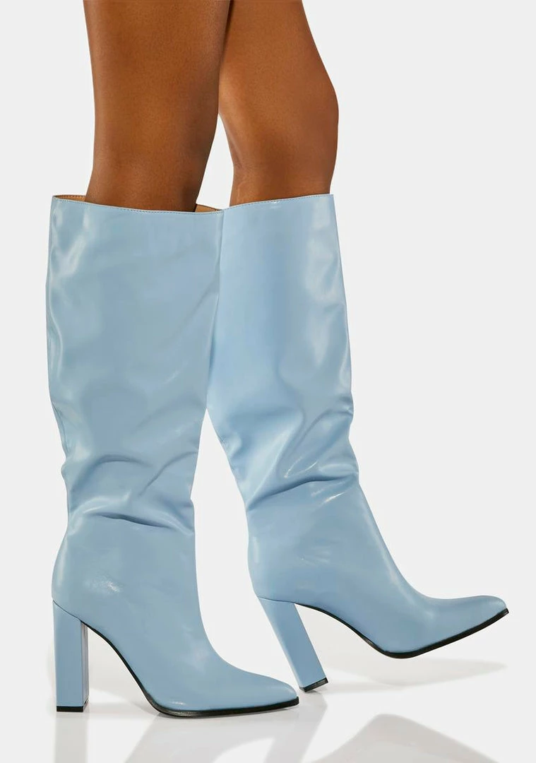 features a vegan leather construction with a matte finish, pointed toes, block heels, and a knee-high fit.