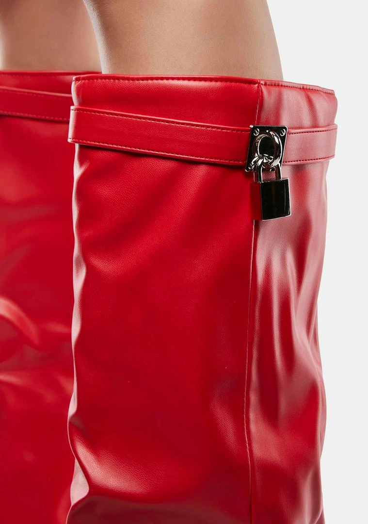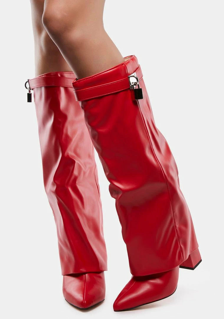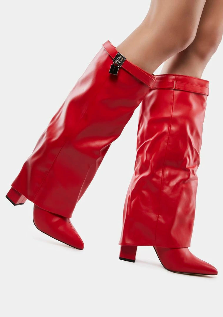 sound the alarm. These knee-high boots have a vegan leather construction, foldover shafts, lock hardware at sides, pointed toes, and block heels.