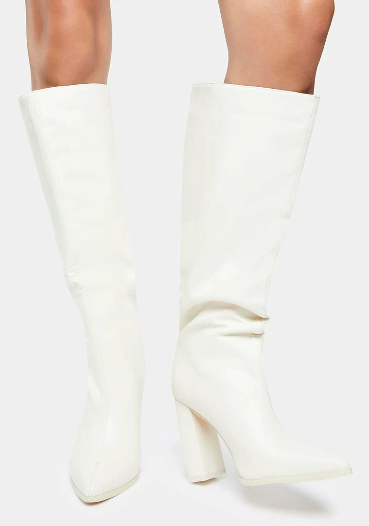 cuz you’re out of their league. These boots come in a vegan leather construction, with a heel, and knee high slip on fit.