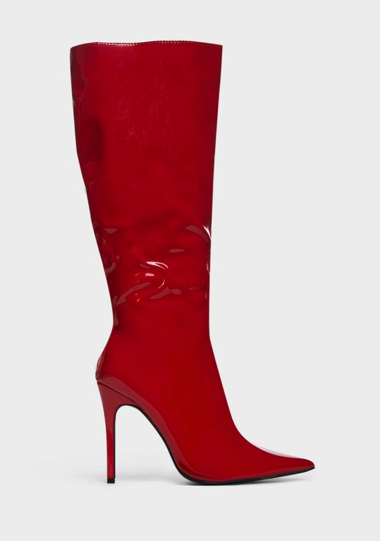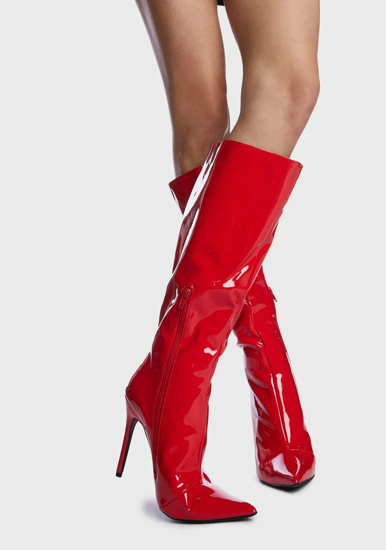 cuz see beyond! These knee high boots have a patent vegan leather construction, a pointed toe design, stiletto heels, and side zipper closures.