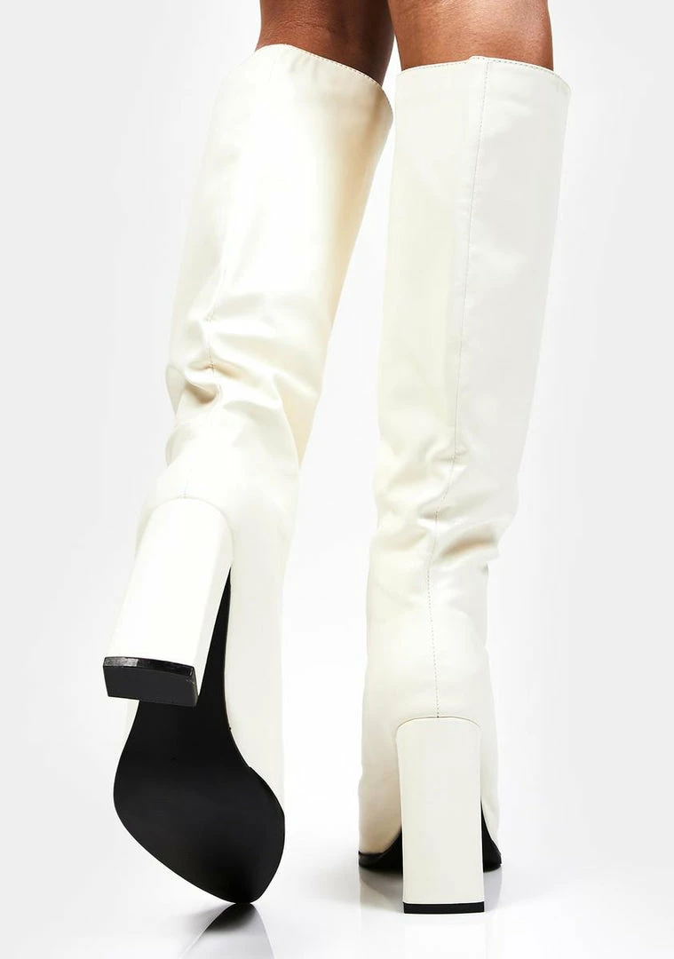 features a vegan leather construction, pointed toes, block heels, and a knee-high fit.