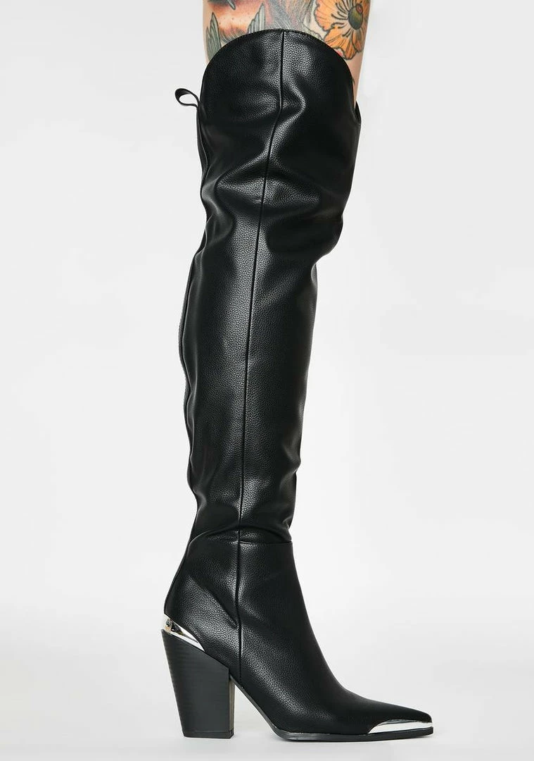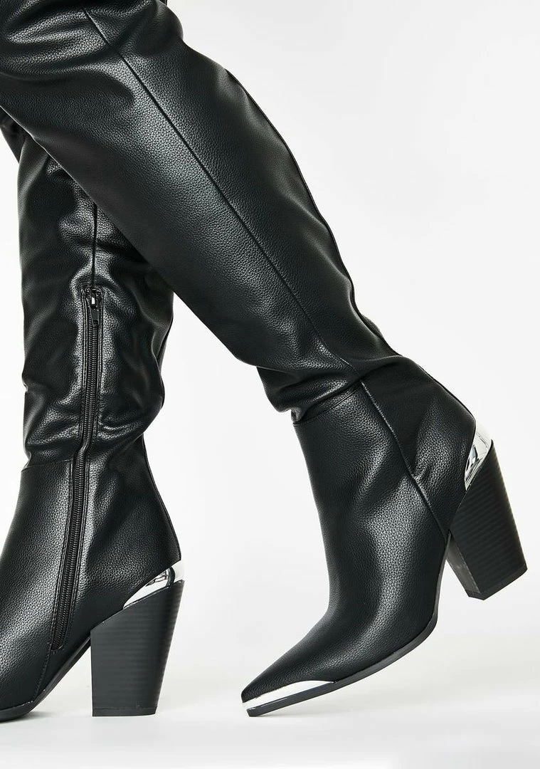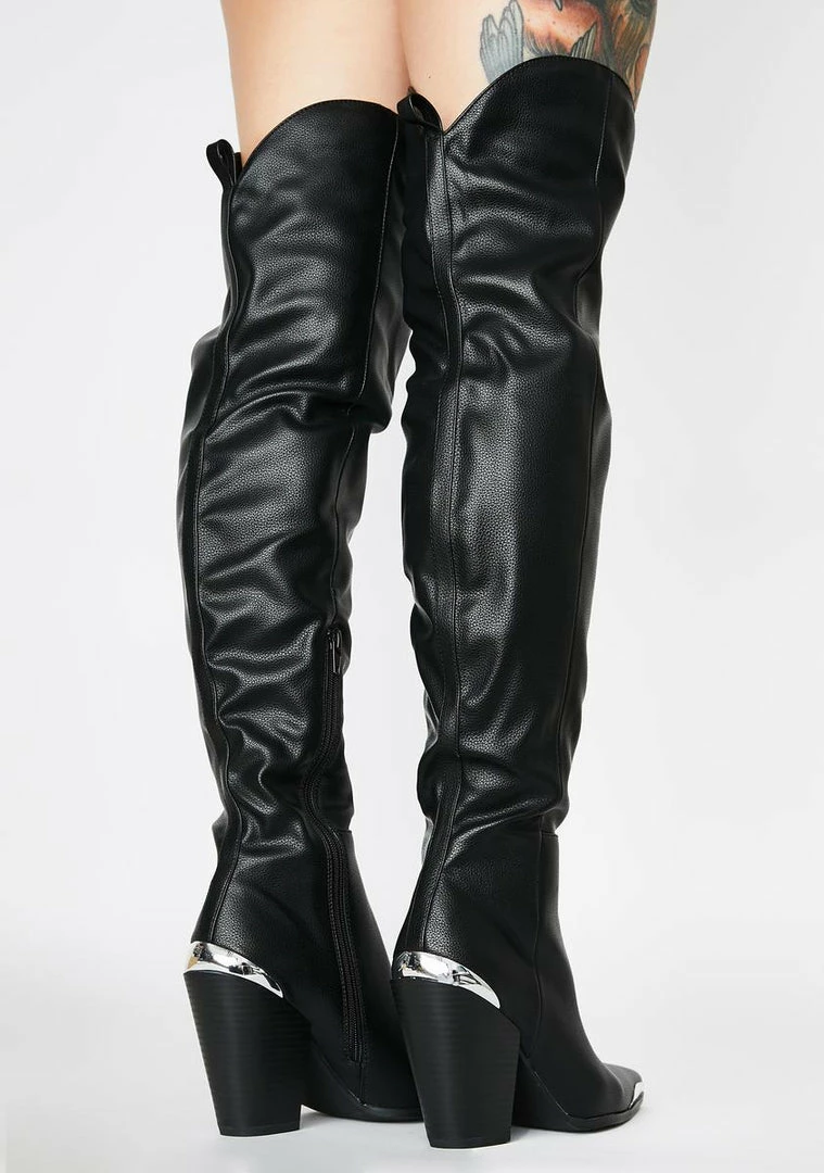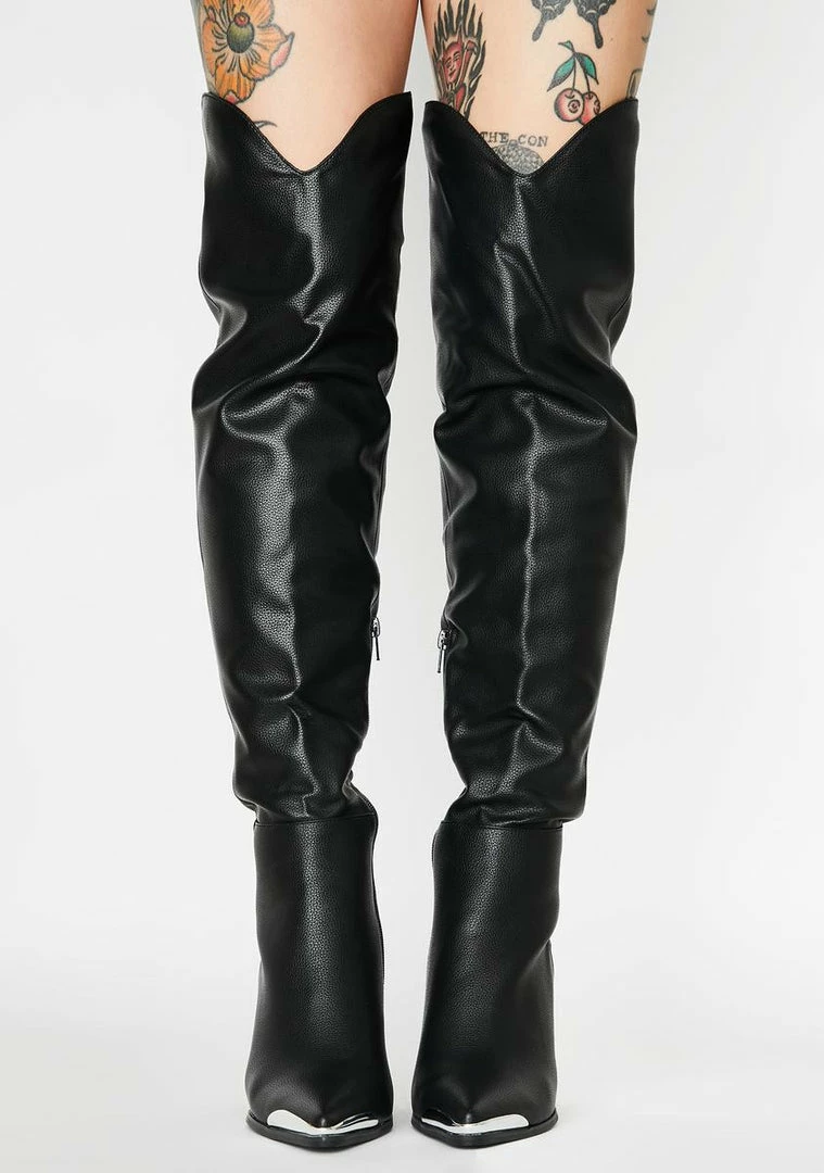 gotcha lookinΓ’ΒΒ epic AF. Set the trend in these thigh high boots that have pointed toes, metallic accents NΓ’ΒΒ side zip closures.