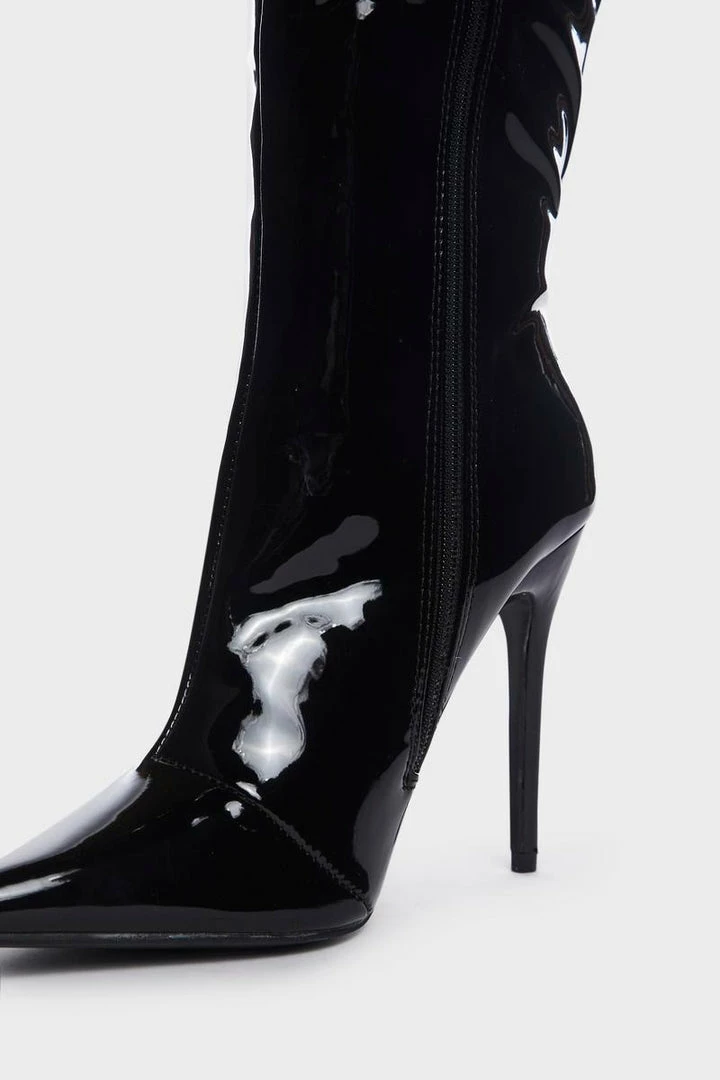 cuz no shoedrobe is complete without boots! These knee-high boots have a patent vegan leather construction, pointed toes, side zip closures, and stiletto heels.