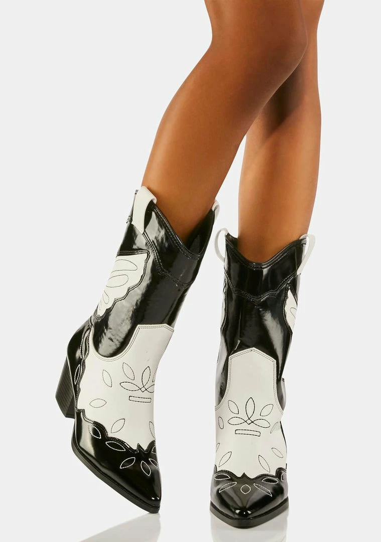you’re the new sheriff in town! These cowboy boots have a two-tone vegan leather construction with a patent finish, western embroidered designs, side pull tabs, and stacked heels.