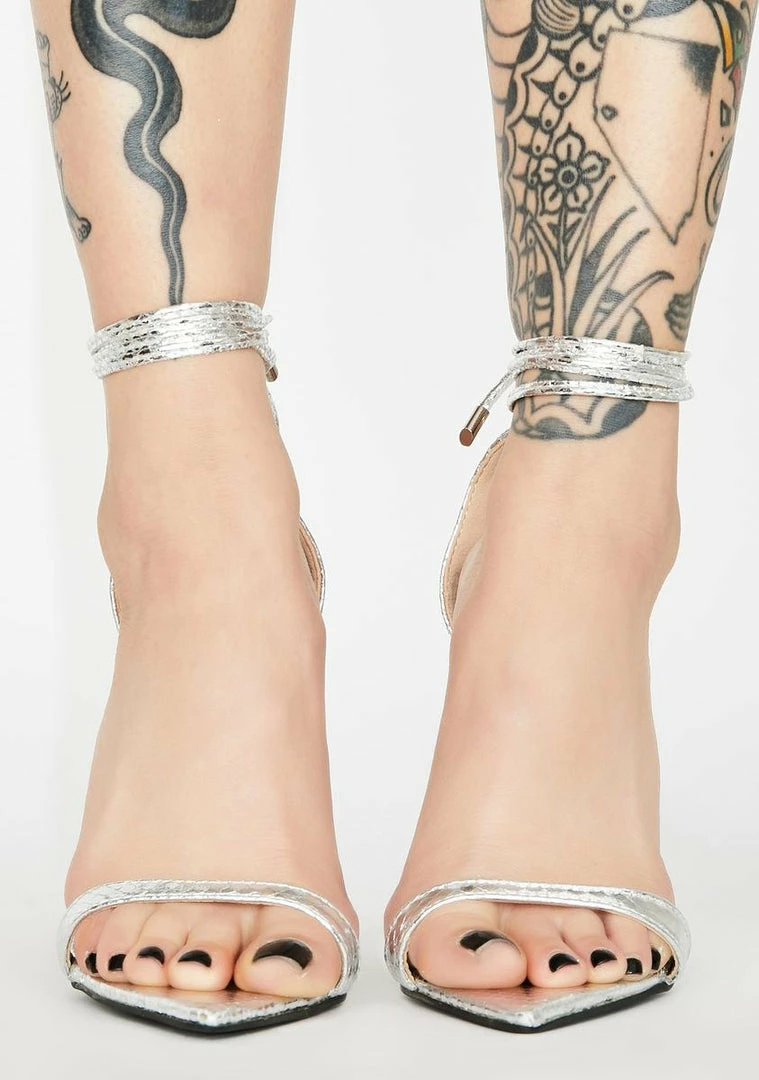 got รขยยem under your spell, bb. They live to please ya in these stiletto heels that have a reflective chrome construction, a peep toe, and lace up ankle straps.