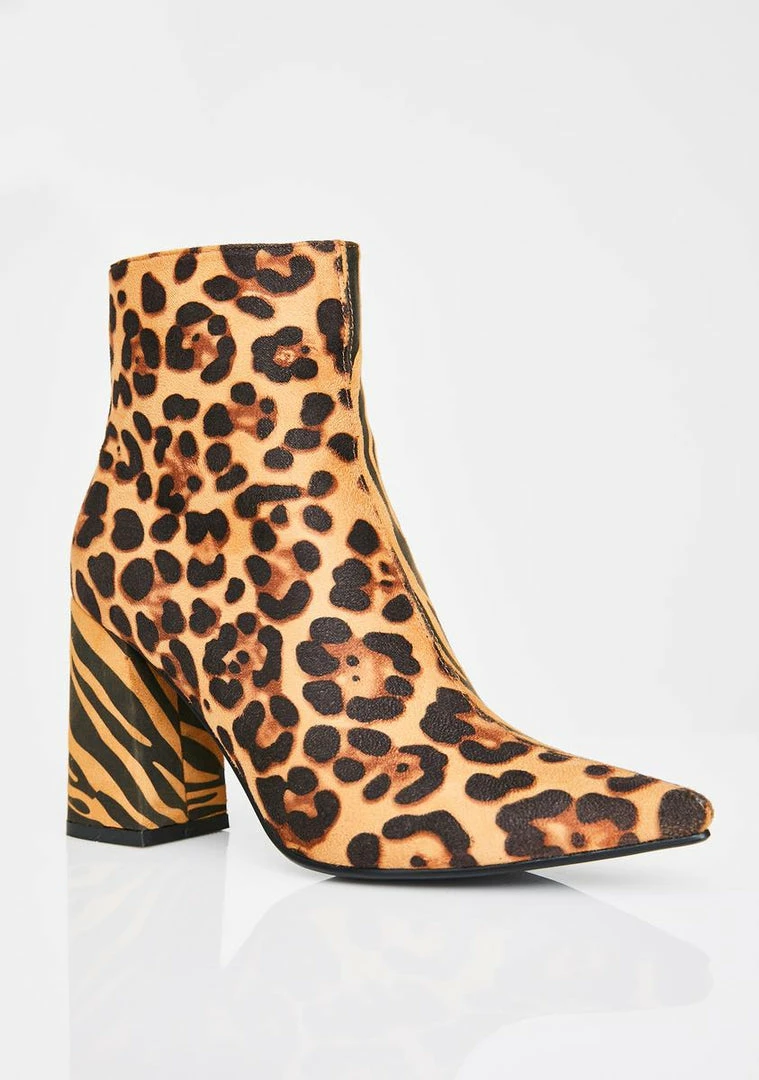 are double trouble and twice as nice! These dope ankle boots have stacked heels, allover leopard and tiger print and inside zipper closures.
