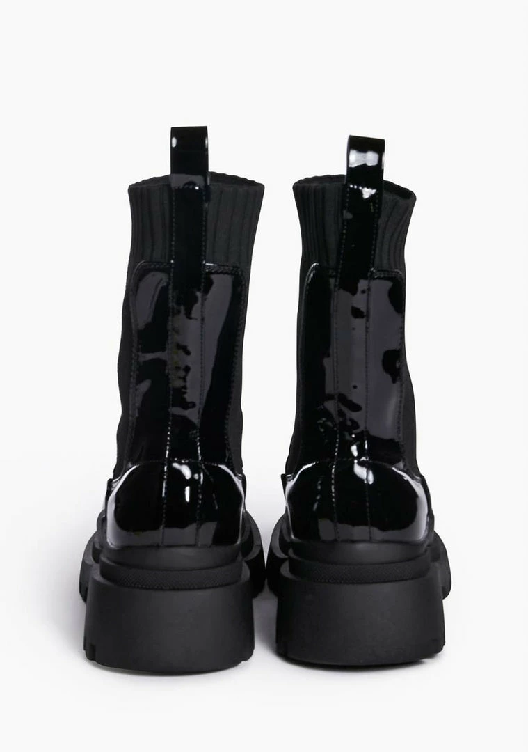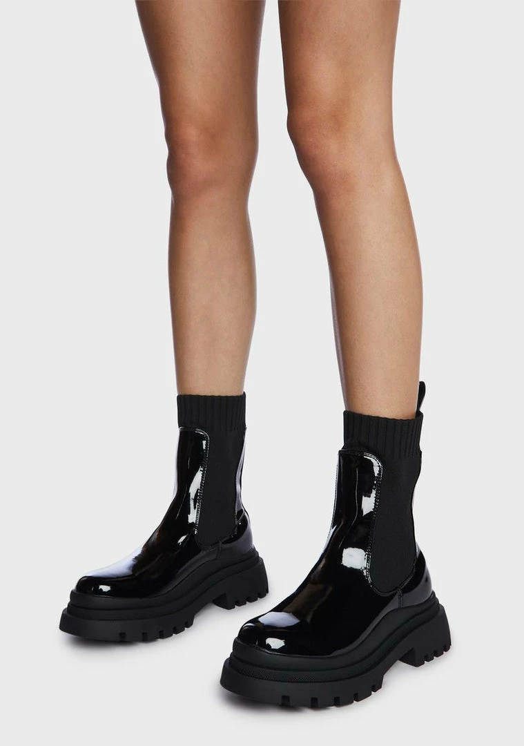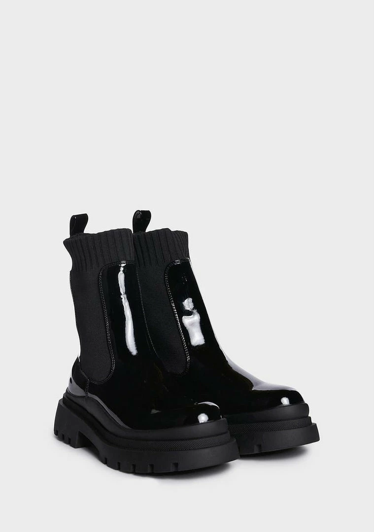 cuz rock and roll! These boots have a vegan leather construction, a patent vinyl finish, ribbed sock detailing, treaded soles, and pull tabs.
