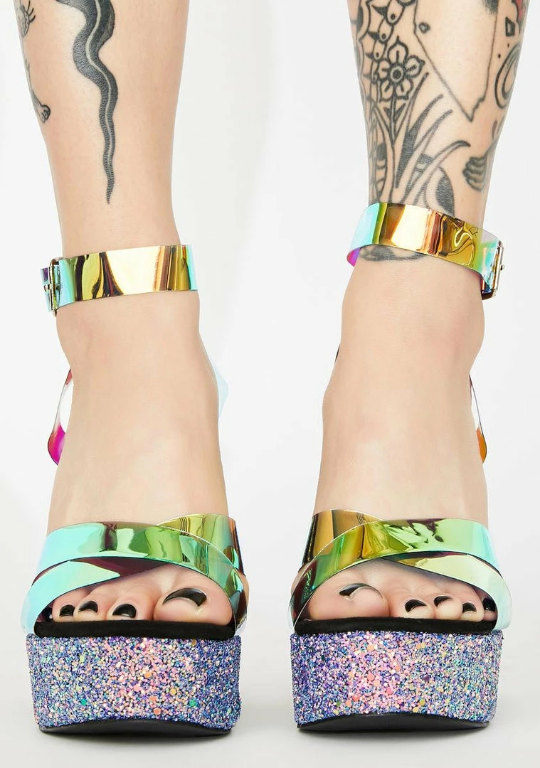 cuz glitter is a girlΓ’ΒΒs best friend! YouΓ’ΒΒre a total stunner in these platform heels that have a sparkly glitter sole, iridescent ankle and toe straps, and a sturdy block heel.