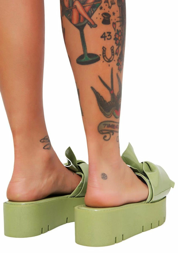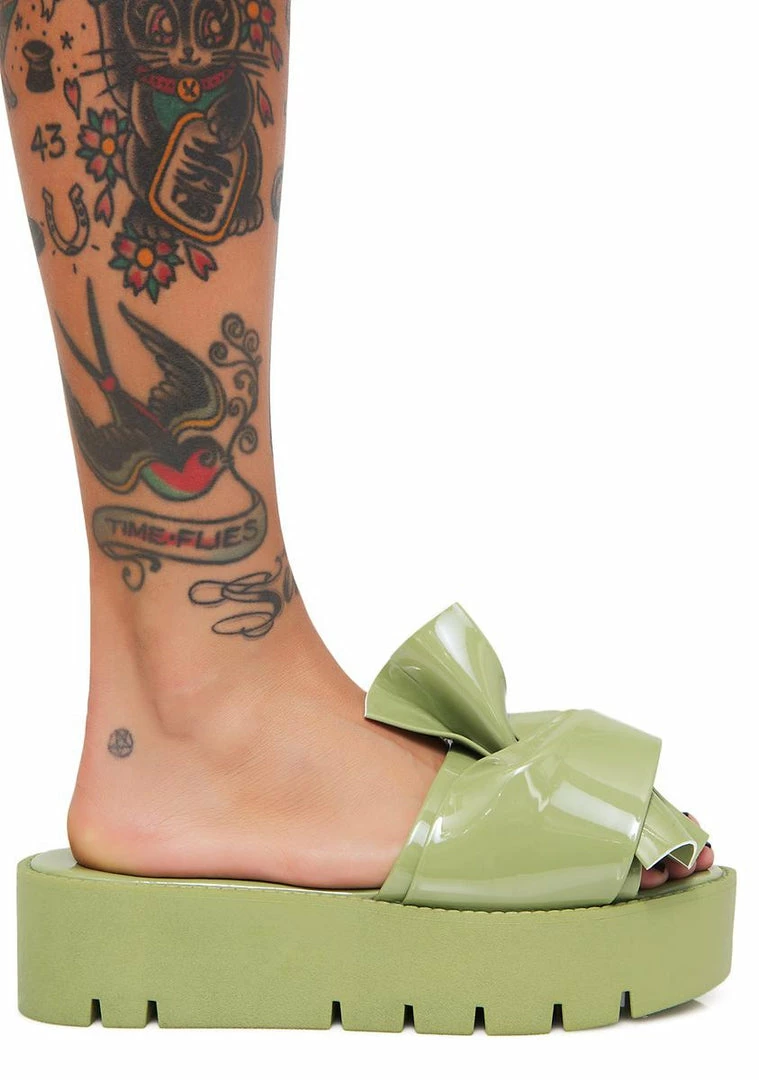 will get âem tied up in their feelings about ya. These sikk patent slides have a knotted design on the top and chunky cleated platforms.