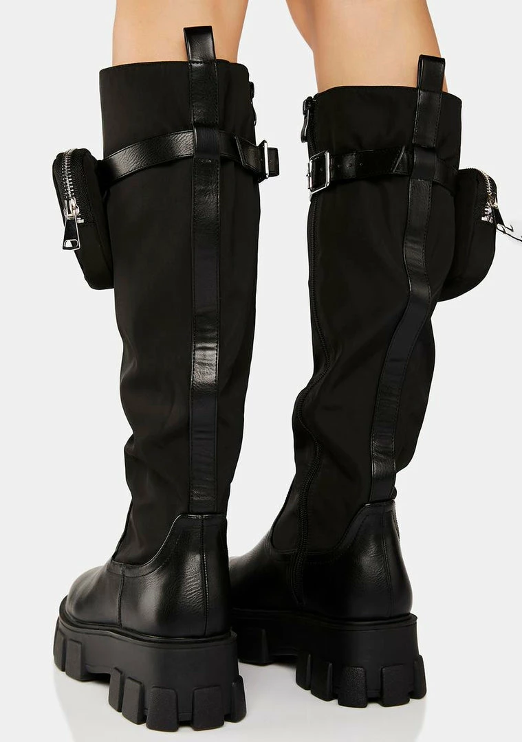 will have you makin’ appearances. These knee-high boots have a vegan leather construction, buckled cargo-style pockets at sides with wraparound zippers, inner zip closures, treaded outsoles, and heel loops.